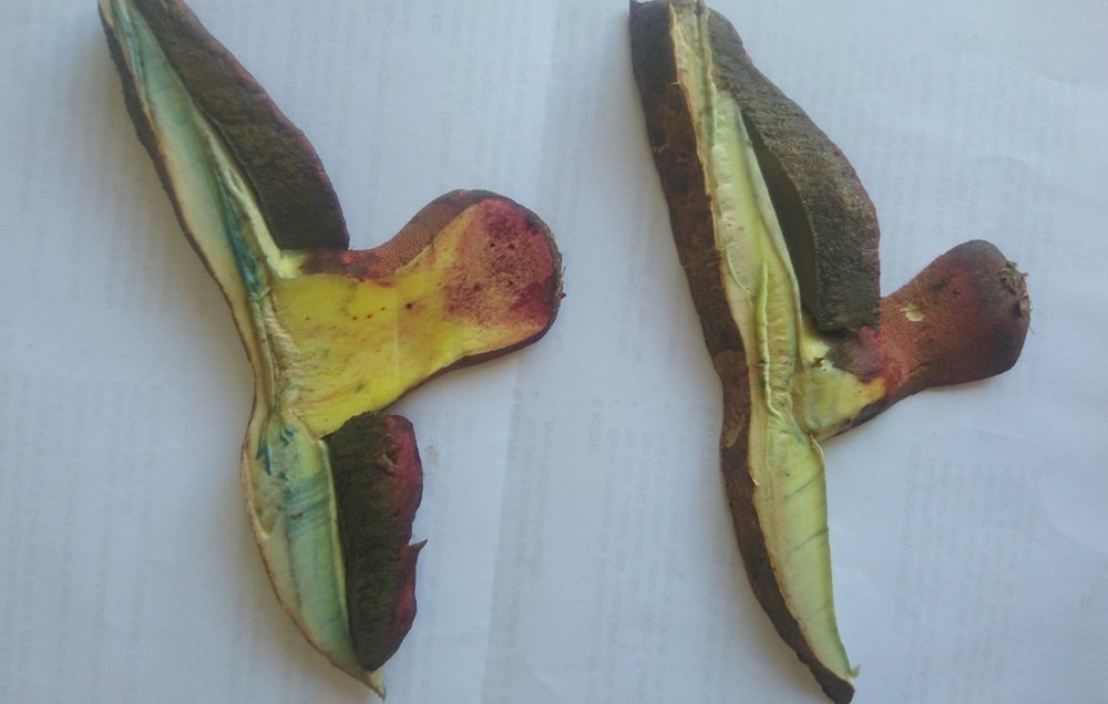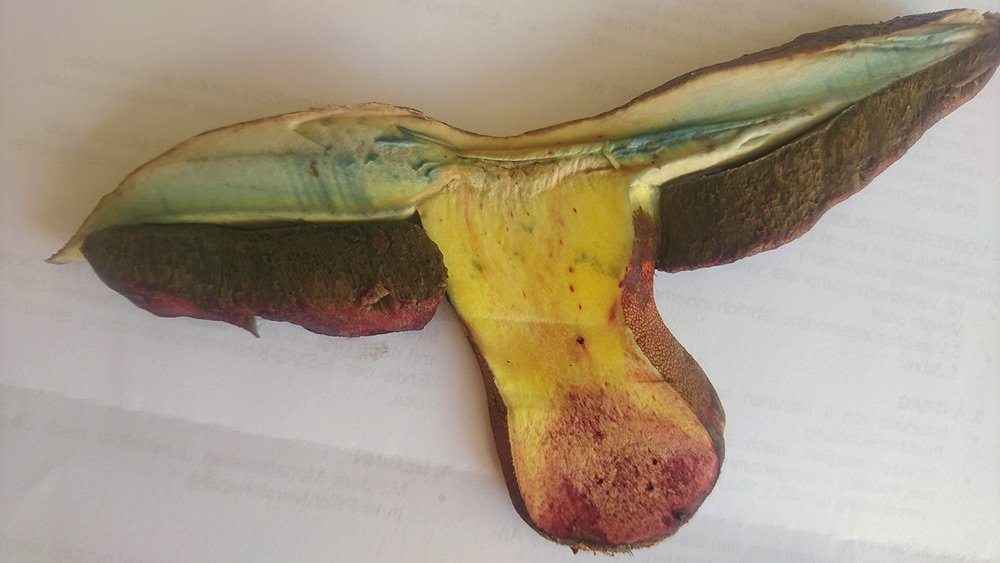 bei der Bestimmung wegrechnen. Im Schnitt sind beim frischen Pilz Hutfleisch himmelblau und Stielfleisch gelb.