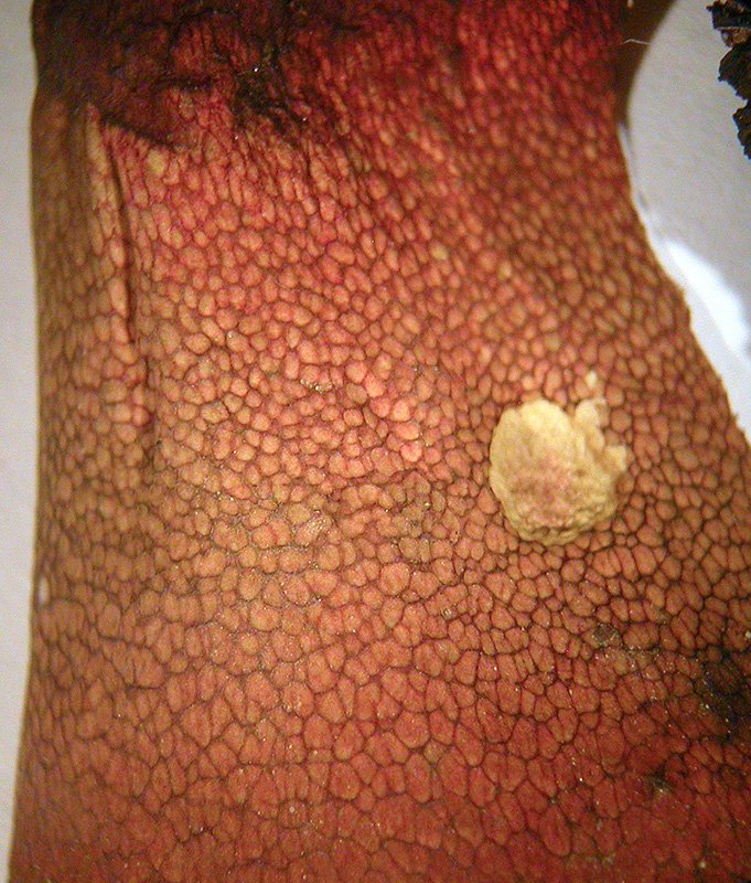 mir ist da heute ein Röhrling zur Begutachtung zugetragen worden, den ich gerne als Rotviolettverfärbende Varietät des Netzstieligen Hexenröhrlings sehen möchte. Leider ist diese Varietät sehr rar, und da ich bei Röhrlingen nicht so sicher unterwegs bin, wäre es schön, wenn sich einer von Euch melden würde, der diese Varietät eventuell schon einmal gefunden hat. Typisch ist ja bei den Hexenröhrlingen, daß sie im Schnitt eine mehr oder weniger sofortige Blau(violett)verfärbung zeigen, die dann verblasst. Beim Netzstieligen Hexenröhrling ist der Röhrenboden normalerweise orange, hier gelb. Das Fleisch gelblich und in der Stielbasis rot. Weil sich das Fleisch im Anschnitt gar nicht verfärbt hat, habe ich zuhause auf die gelben Partien einen Schuss Melzer gegeben, woraufhin sich das Fleisch an dieser Stelle sofort dunkel blaugrün verfärbt hat. Eine leichte bläuliche Verfärbung gab es nur im Hutfleisch sofort, im Stielfleisch ist erst nach 7 Stunden stellenweise eine leicht blaugrüne Verfärbung in den gelben Partien eingetreten. Der Röhrling wurde bei Eiche gefunden.