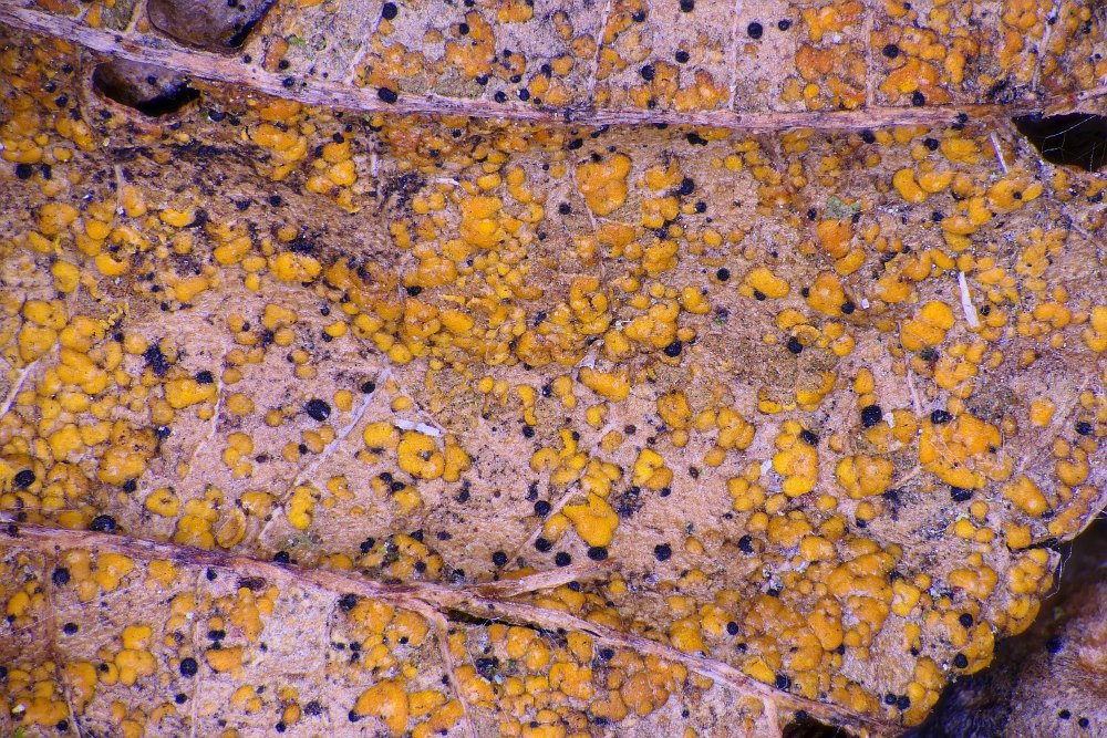 Diese kleinen gelben "Pustelpilze" habe ich gestern auf einem am Boden liegenden, vertrockneten Erlenblatt gefunden.