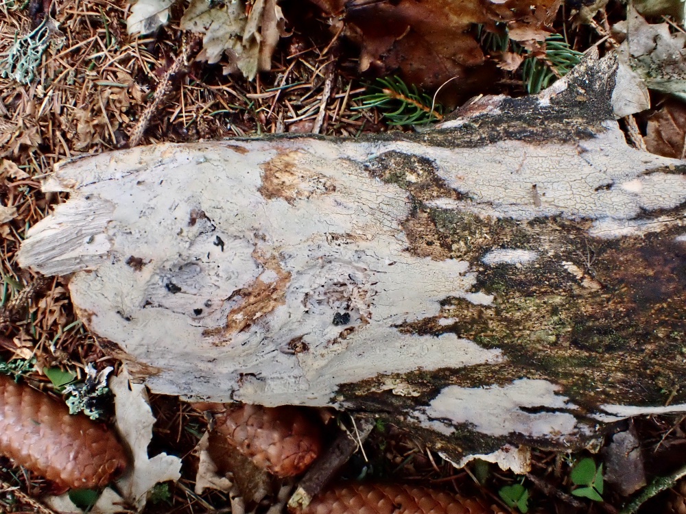 hier ist noch ein Rindenpilz den ich als Athelopsis lacerata (Amylocorticum laceratum) bestimmt habe. Zuerst war ich mir sehr sicher in der Bestimmung, wobei mir bei einer Nachrecherche dann doch auch noch recht unterschiedliche Informationen in den Literaturquellen aufgefallen sind, sodass eine Restunsicherheit bleibt, die dadurch verstärkt wird, dass ich die Gattung noch nie mikroskopiert habe.