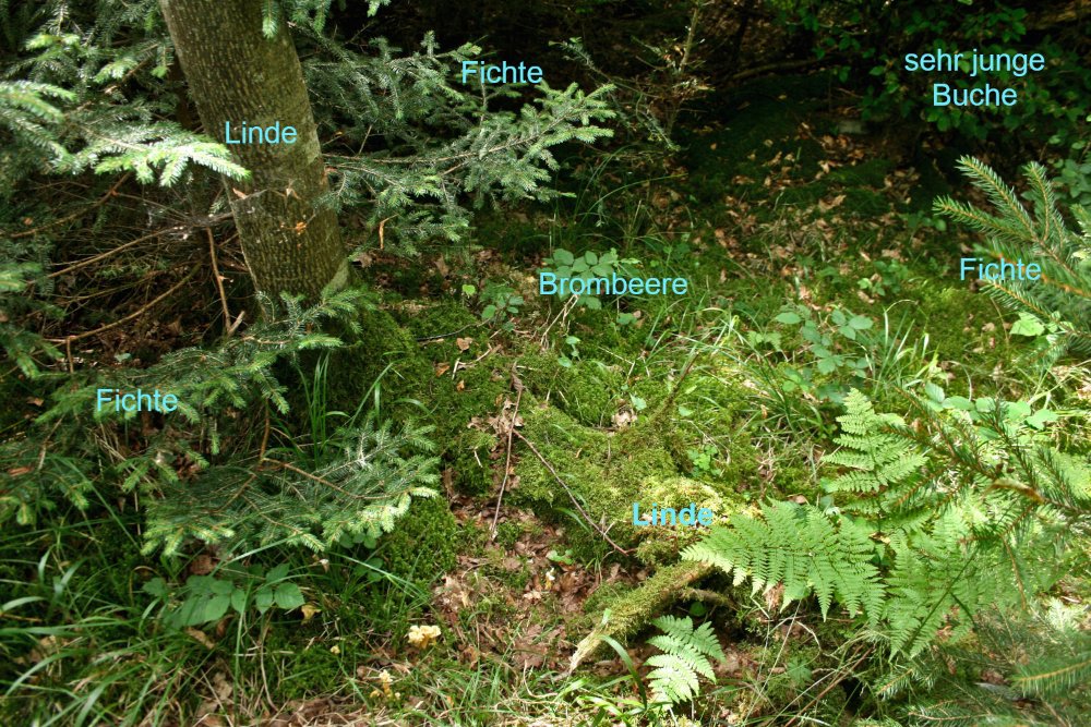 • Wuchsort direkt unter einer Linde (Stamm-Ø 15 cm), weitere Junglinden, viele sehr junge Fichten (Stamm-Ø 1 – 4 cm), eine sehr junge Buche (3 m entfernt), Brombeeren, Farn, Gras – siehe Foto. Relativ hell – außer der Linde keine größeren Bäume in Sonnenrichtung. Die Frk. wachsen aus dem Boden, kein Holz ertastbar.