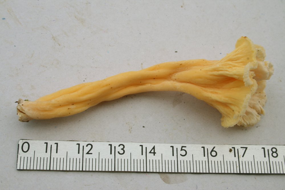 Die Gattung Craterellus sollte m.E. stimmen, aber mit der Art C. sinuosus kann ich mich nicht wirklich anfreunden. So hat mein UMO-Fund nicht viel Ähnlichkeit mit der Krausen Kraterelle – Farbe, Form, z.B. hat mein UMO von Anfang an immer einen hohlen Stiel, viel kleinerer "Hut".