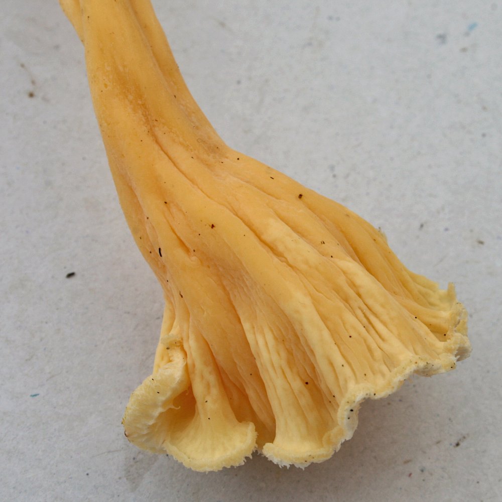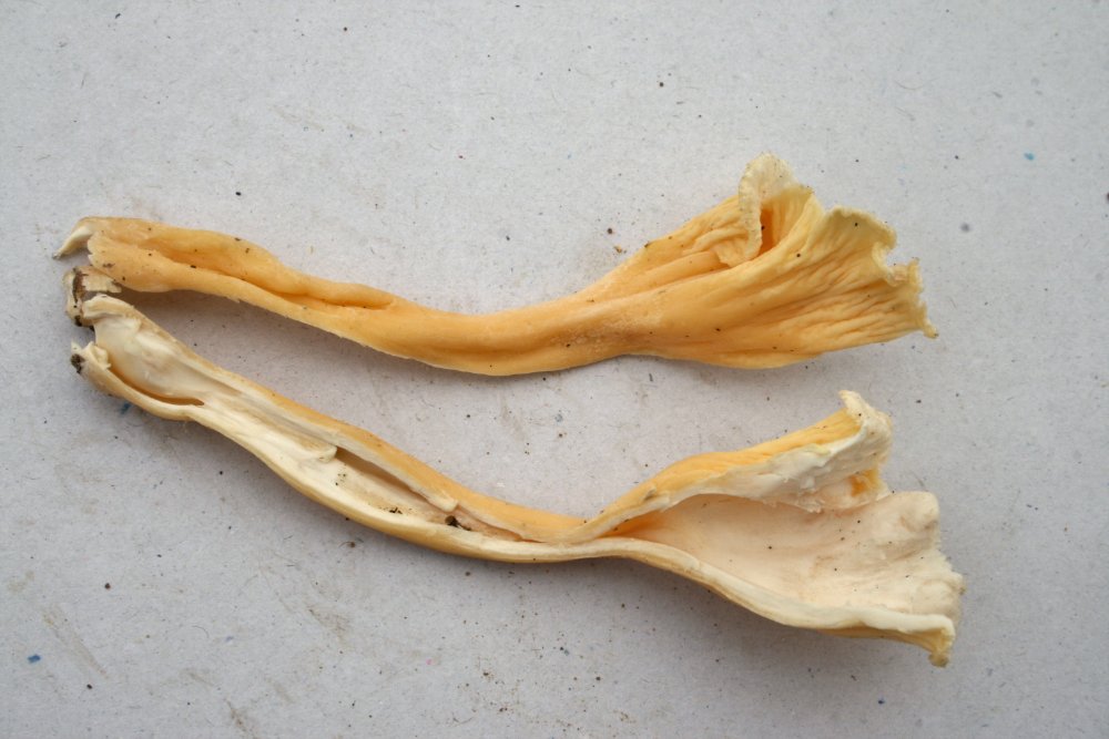 Rein prinzipiell denke ich auch, dass dieser Fund in die lutescens/tubaeformis-Ecke gehört, vom flachen Hymenophor ausgehend eher zu lutescens. Aber für eine Zuordnung zu diesen gibt es m.E. zuviele Widersprüche. Noch ein Foto der Exsikkate – auch hier auffällig die weiße Innenseite!
