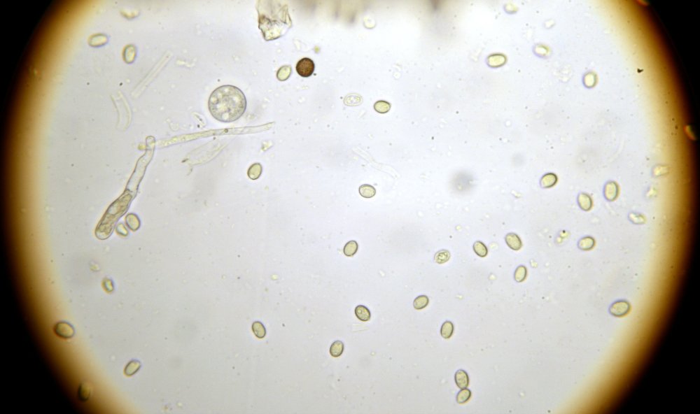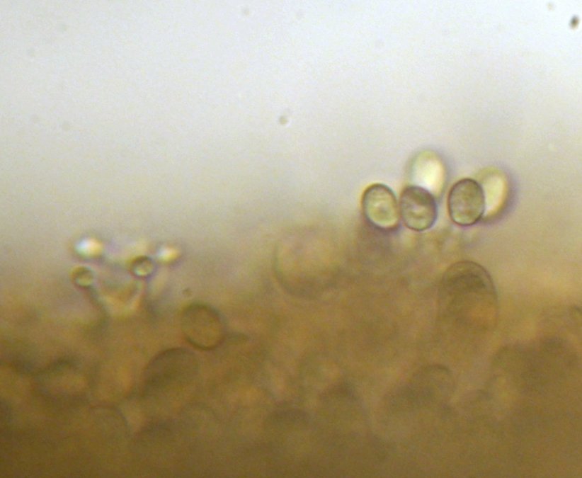 • Sporen im Durchlicht und Wasser leicht gelblich, ellipsoid mit leichter Apfelkernform, Größe 10,1 x 7,2 (9,2 – 12,6 x 6,3 – 7,8), Q = 1,46 (1,3 – 1,6); n = 16