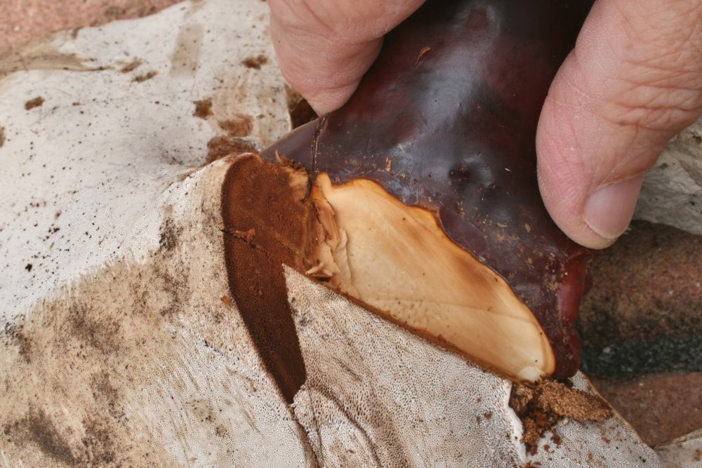 Trama hell-lehmfarben; 4 – 5 Poren pro mm, Hymenium dunkel rotbraun, ca. 1,5 cm dick – ich glaube 4 Schichten zu erkennen – der gesamte Frk. einschl. Stielspitze lässt sich gut schneiden, nur leicht korkig, sehr nass (der gesamte Frk. wog frisch 650 g).