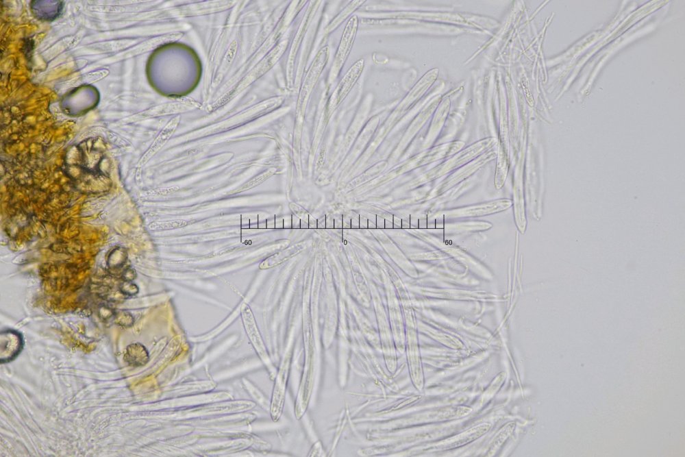 Die Sporen sind laut Beschreibung bündelig, nicht schraubig gewunden, 38–45 x 1–1,5 um groß, fadenförmig (filiform), hyalin, unseptiert und gerade. Ich messe bei mir 30.0-45.4 x 1.6-2.0 um (Q = 19.9-24.3, N = 19). Ein bisschen breit, aber meiner Ansicht nach noch im Rahmen.
