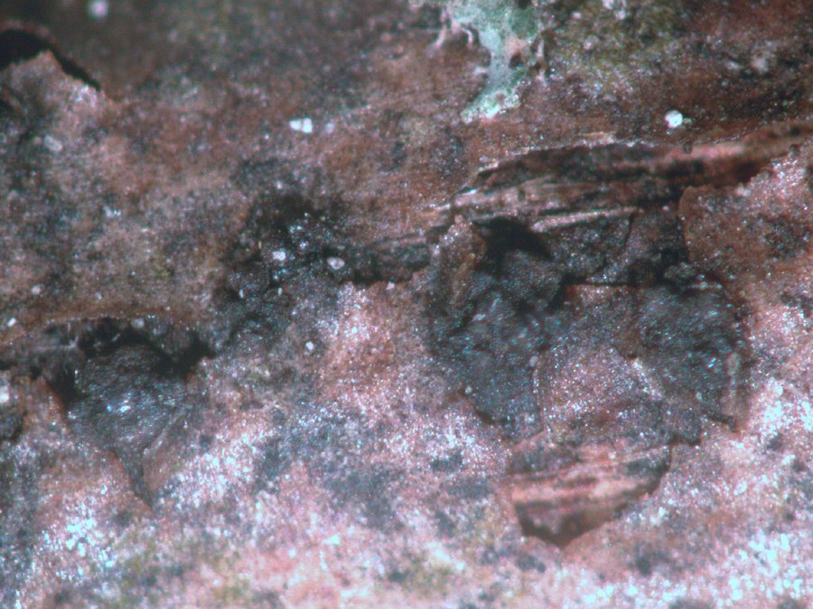 Auf den Ästchen sind sowohl flache kissenförmige Stromata mit herausragenden Ostiolen der darin eingesenkten Pseudothezien,