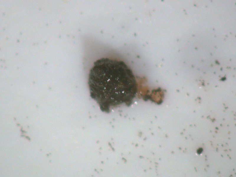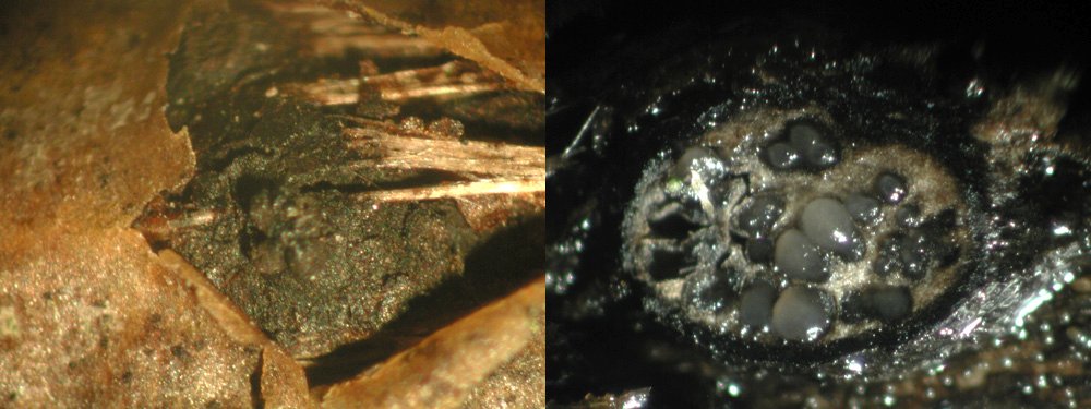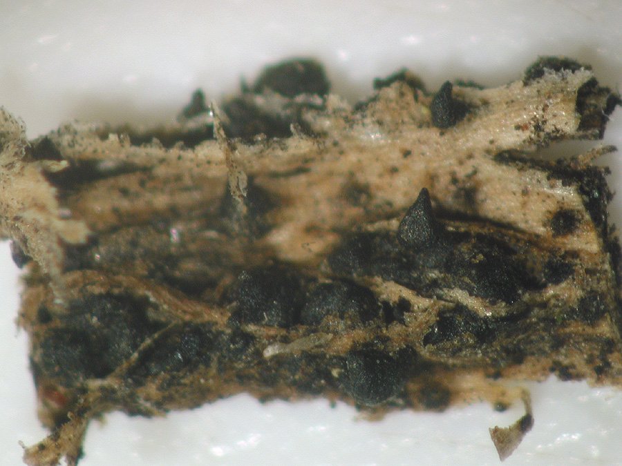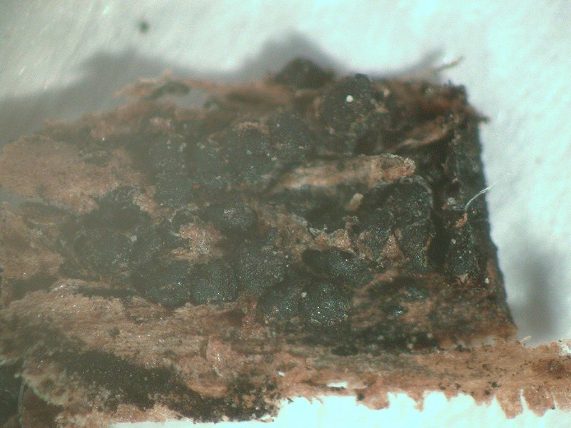 als auch ganz kleine 0,2-0,5 mm große einzelne Pseudothezien, die nicht in einem Stroma eingebettet sind. Ich habe eines davon mikroskopiert, und