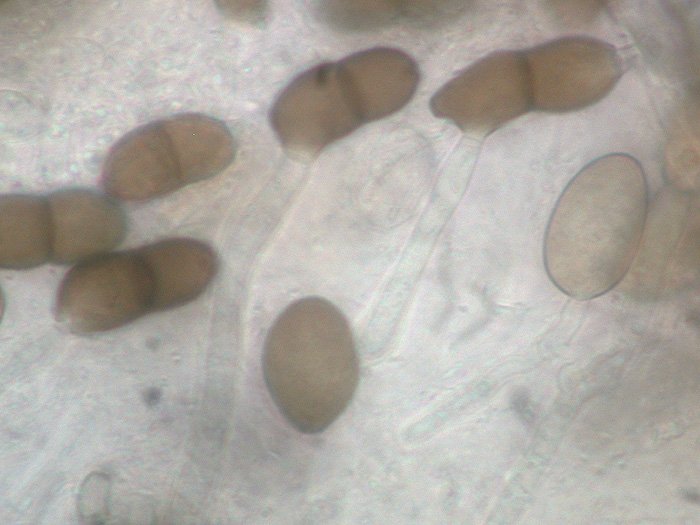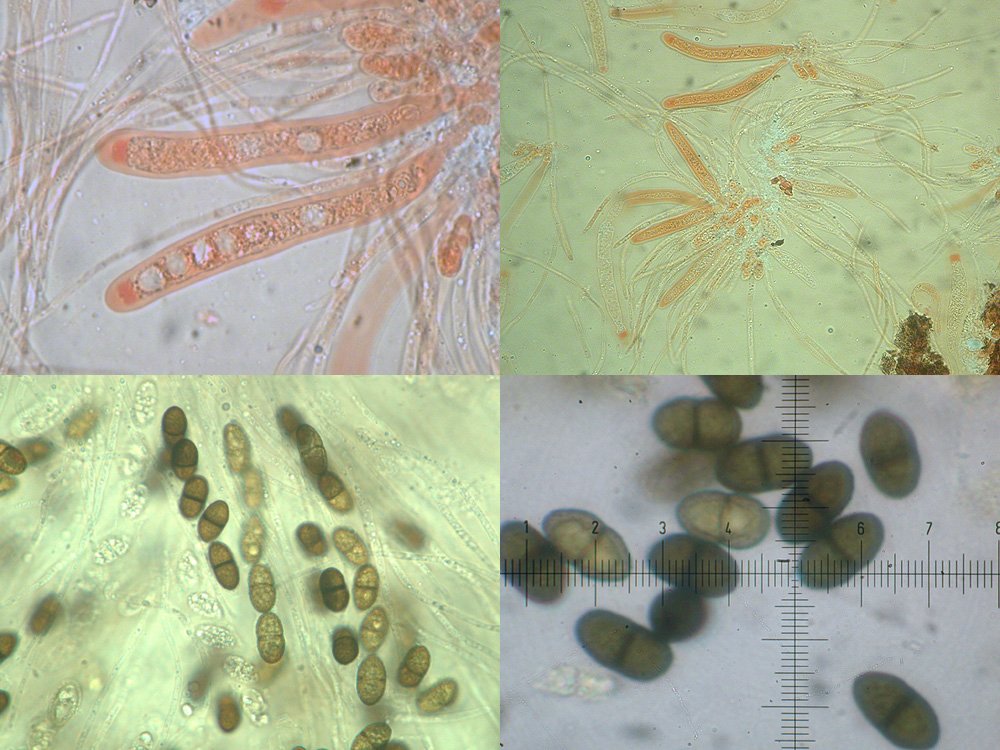 Ich habe 30 Ascosporen vermessen, mit Werten von (14) 15-18 (18,5) x 7,5 - 9 (10) my. Die meisten 16 x 8 my. Es gibt auch Ausreißer nach oben, die habe ich nicht hineingerechnet. Die Sporen sind fein warzig, mit doppelter medianer Septe. Viele reife Sporen sind zumindest an einem Ende etwas abgeflacht, was mich dazu verleitet hat, sie als Konidien zu betrachten.