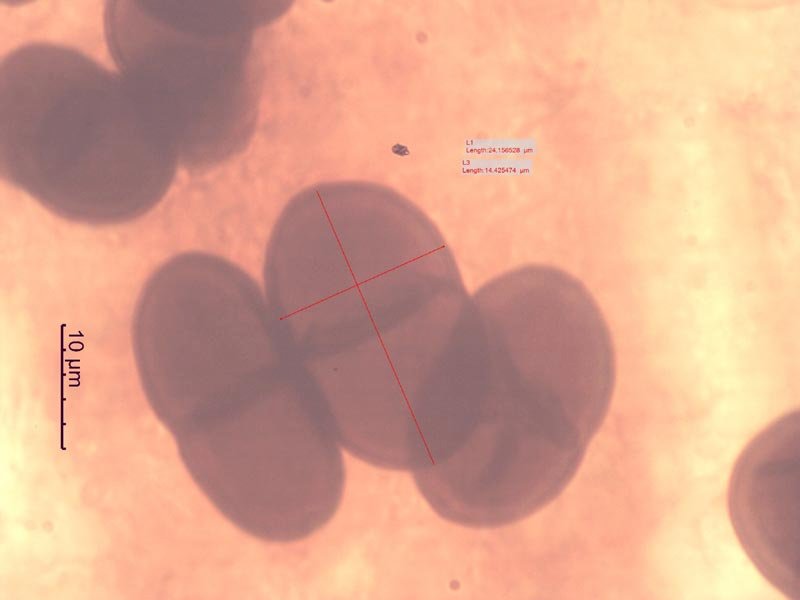 Vermessung der vitalen Ascosporen, weil ähnlich oder dieselben. Ich werde die vitalen Ascosporen noch einmal vermessen, ich vermute, daß diese die Länge von 13-14 my doch nicht überschreiten. Kann erst am Donnerstag wieder mit Pilzen arbeiten. Falls ich noch was herausfinde, melde ich mich im Forum.
