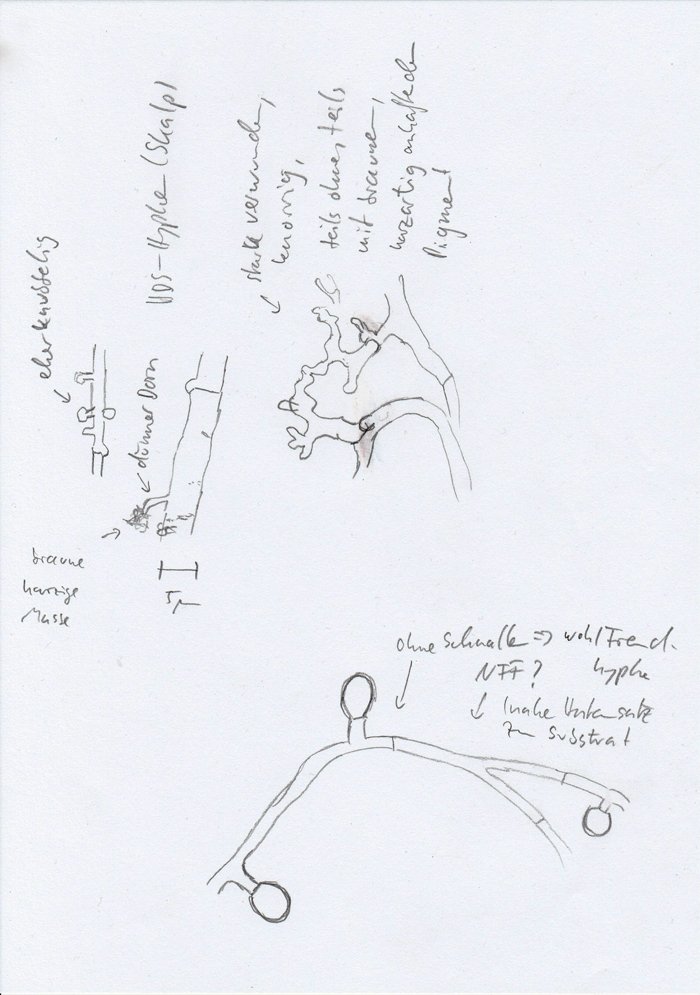 Die HDS besteht aus knorrigen Elementen, teils mit kurzen Seitenstielen und daran undefinierbar tropfiges... es gibt auch ein schwarzbraunes Pigment, das wie Harz an den Hyphen kleben kann (Bereiche zwischen den Hyphen auffüllend); richtige Haare mit vielen fingerartigen Auswüchsen konnte ich aber nicht finden:
