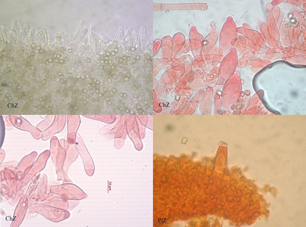 Die schmalen Zystiden alle glatt. Pleurozystiden breitspindelig, meistens mit Kristallschopf, der ebenfalls schnell abfällt.