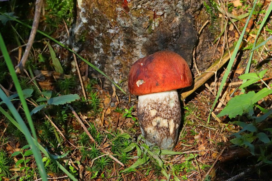 Als ich am 10.09.2019 unsere Pilzfunde putzte, ist mir eine Rotkappe besonders aufgefallen, weil sie in Hutfarbe und Konsistenz von den anderen, in meiner Wahl-Zweitheimat gefundenen Rotkappen abwich. Die Huthaut war samtig, die Hutfarbe war fast wie Rotwein, richtig intensiv dunkelrot. Gefunden hat sie mein Mann in einem Nadelwald, wo ausschließlich Fichten wachsen, Birken gibt es am Fundort keine einzige, auch keine zweinadeligen Kiefern. Aber Heidelbeeren. Der Fruchtkörper fruktifizierte in der Nähe eines Fichtenstammes und war unter dem untersten Ast der Fichte gut versteckt. Die Konsistenz war sehr fest, fast hart. Höhe des Fruchtkörpers ca. 10 cm. Leider war der Pilz an der Stielbasis schon gut vorgeputzt, aber den Fruchtkörper auf einen Zahnstocher gestellt habe ich ein Fundortfoto unter den Fichten hinterm Haus nachempfunden.