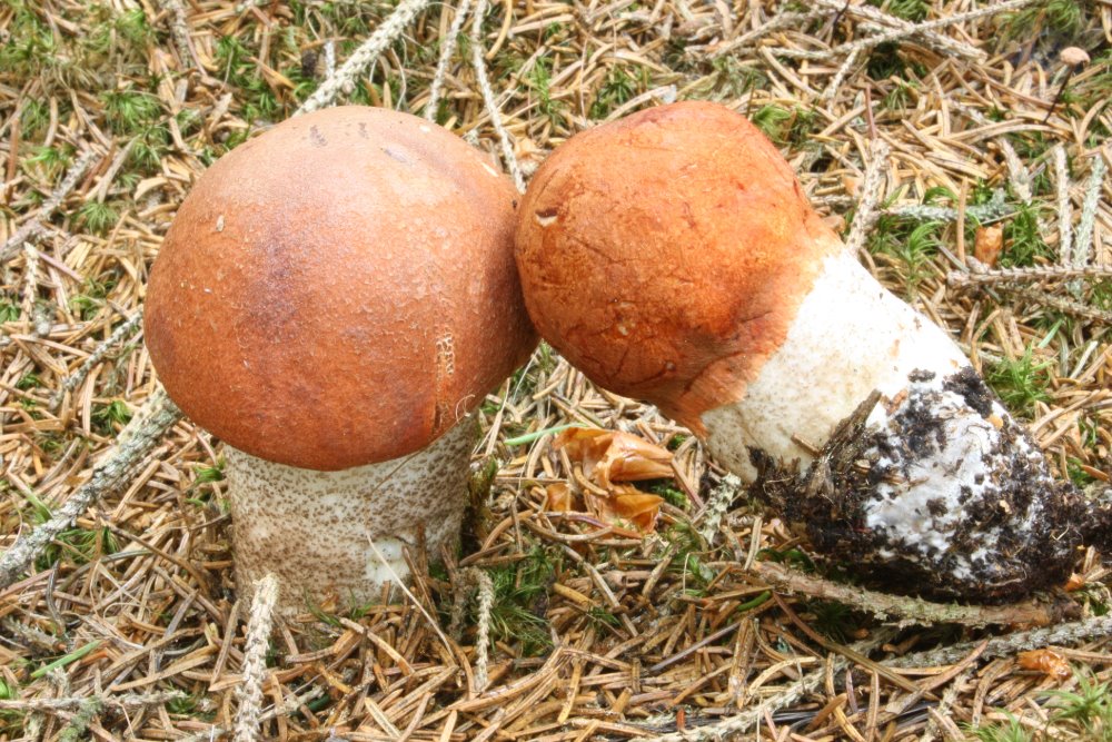 Leccinum piceinum (Fichten-Rotkappe): Stielschuppen schwarz, Stielspitze weniger schuppig, unter Fichten