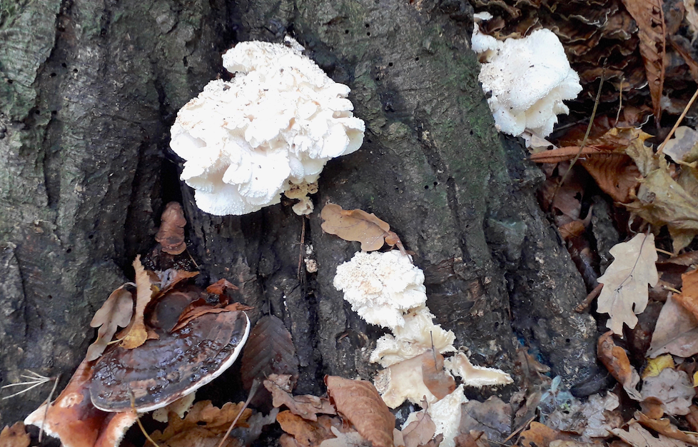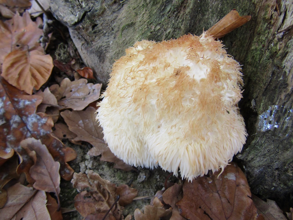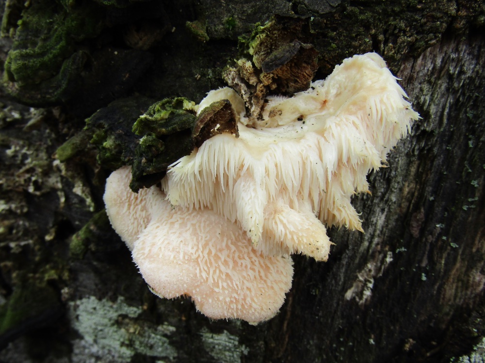 Im nahen Eichenwald überraschte mich dann an der Basis eines Eichenstammes ein Exemplar von Hericium. Ich vermutete H. erinaceus, den Igel-Stachelbart. Der einsame Pilz sollte nicht dem Mikroskop zum Opfer fallen und blieb zum Aussporen im Wald. Zuhause vor einigen offen liegenden Büchern grübelnd bin ich mir nun aber nicht ganz sicher, ob es nicht auch H. cirrhatum sein könnte. Welche der beiden Arten könnte es sein? Vielleicht lässt es sich aus den angefügten Bildern ableiten.