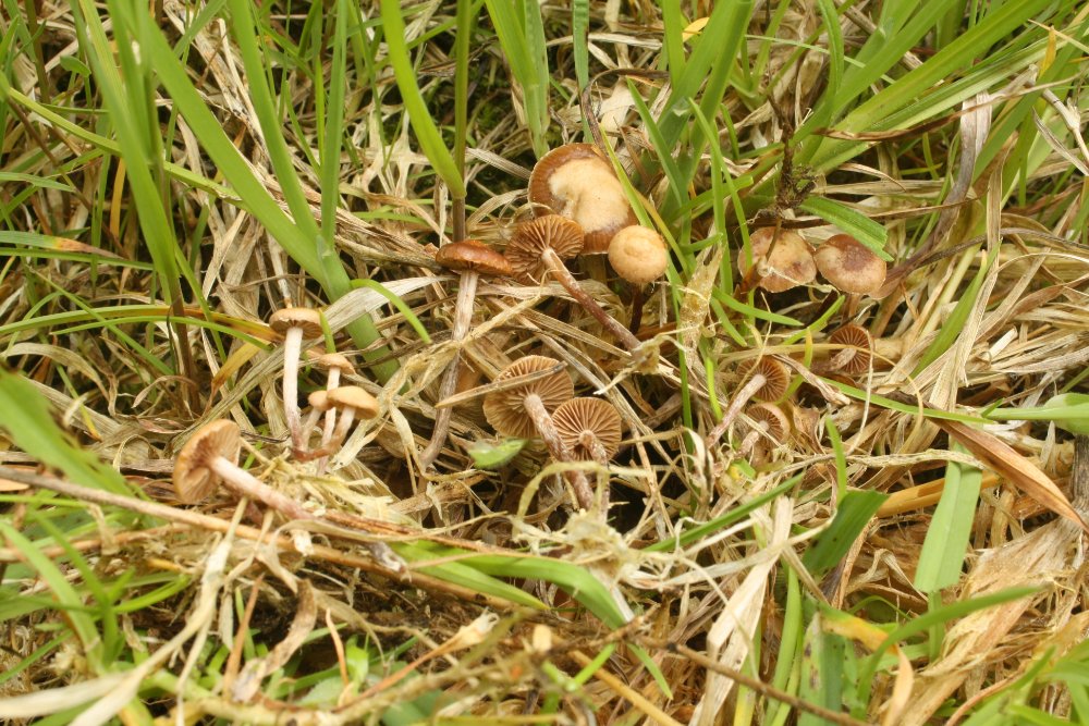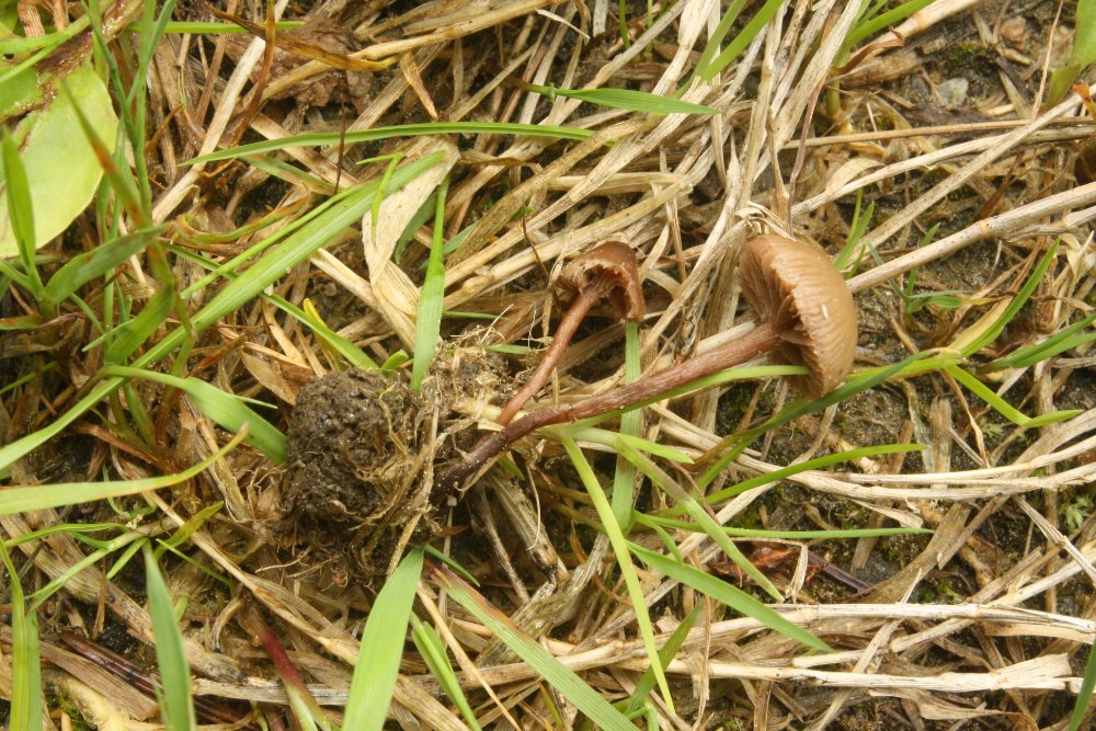 Beim ersten Pilz habe ich bereits eine Vermutung und werde auch das Mikroskop noch anwerfen. Ich denke, diese kleine rötlichbraunen Pilze aus der Wiese, die direkt auf Pflanzenresten wuchsen, könnten Deconica inquilina sein. Sie haben jung ein weißes Velum, der Stiel ist lila überhaucht und nach unten hin dunkler, er ist weiß überfasert. Die Lamellen sind bräunlich und der Hut ist stark hygrophan.