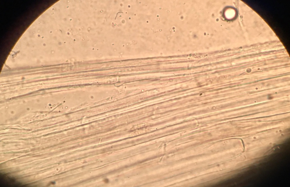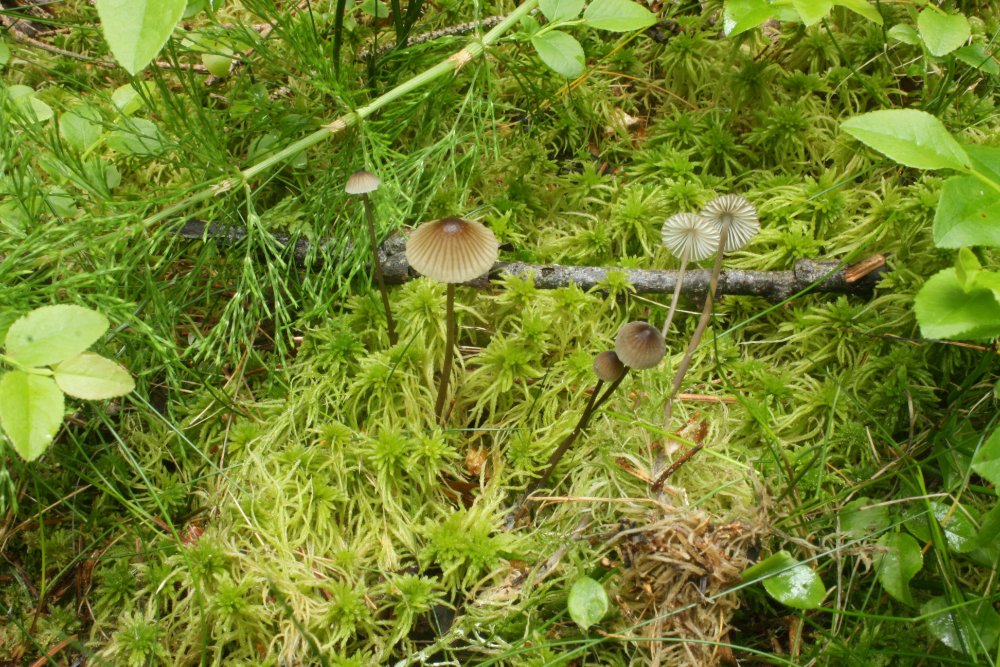 Im Sphagnum fanden wir eine Mycena, die der von Joachim stark ähnelt. Der Stiel ist glatt, jung lilabraun und im Alter eher braun, an der Basis ist weißer Myzelfilz. Die Lamellen sind weiß und haben einen leicht bläulichen Schimmer. Geruch haben wir keine wahrgenommen. Ich hab mal ein bisschen gesucht und bin auf Mycena concolor gestoßen. Mal sehen, was das Mikroskop enthüllt.