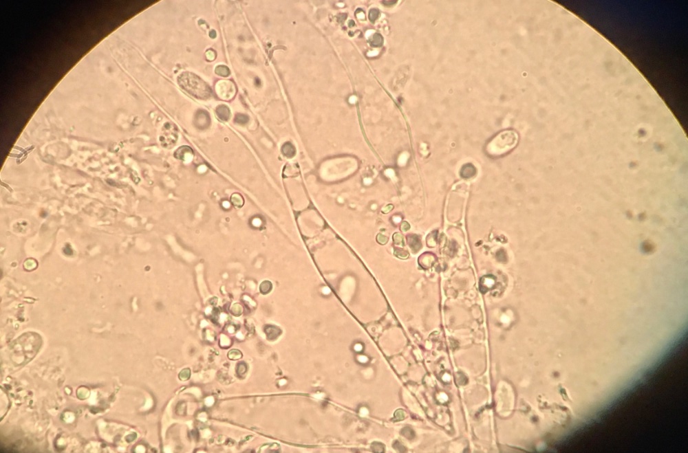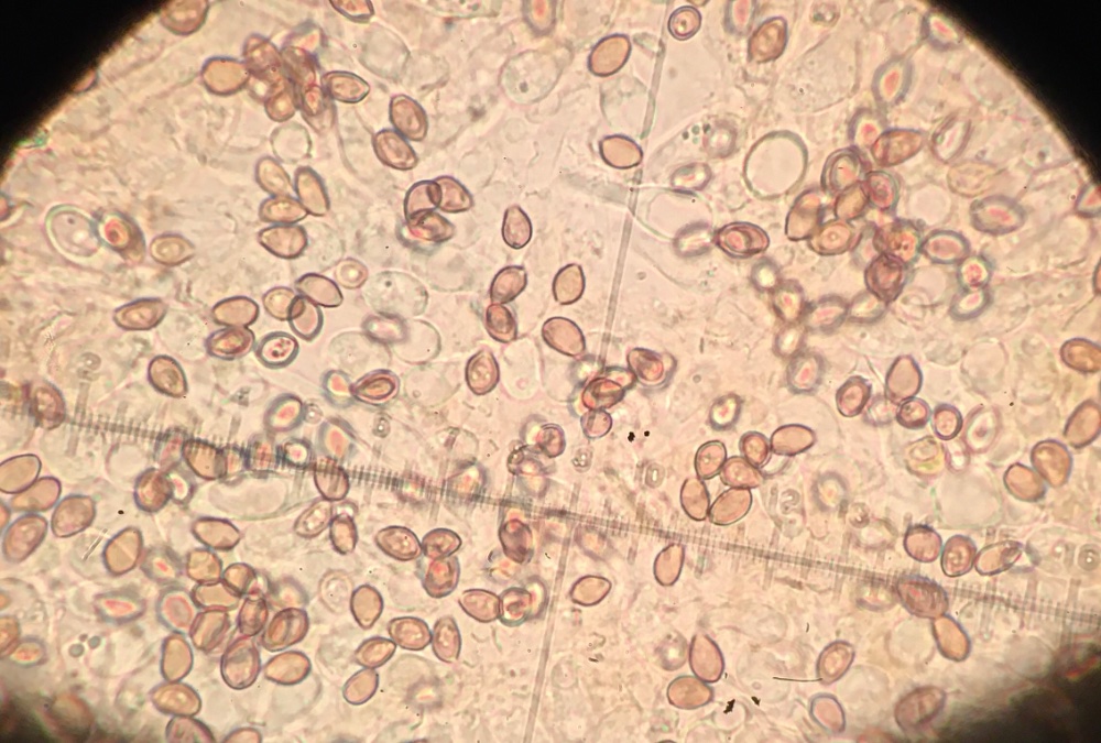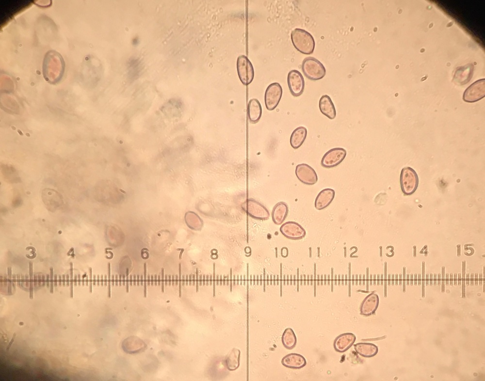 ich hab die Pilze mikroskopiert, doch leider fehlt mir die passende Literatur. Jedenfalls sind die beiden kleinen braunen tatsächlich die gleiche Art, die sporengröße und -form passt meines Erachtens zu Deconica inquilina, wenn ich mit den Angaben im Internet vergleiche. Die Klebrigkeit des Huts konnte ich nicht überprüfen, weil sie schon zu trocken sind und das Anfeuchten hat auch nicht geholfen.