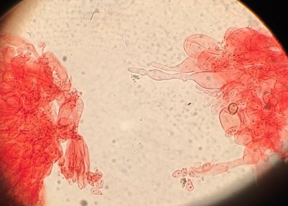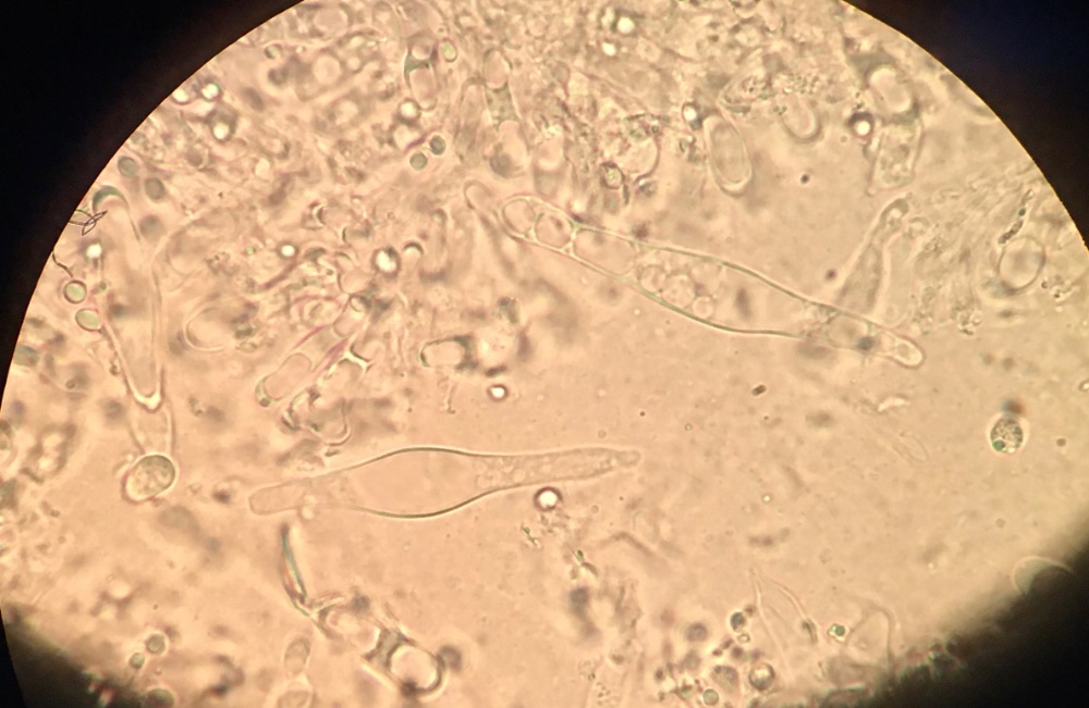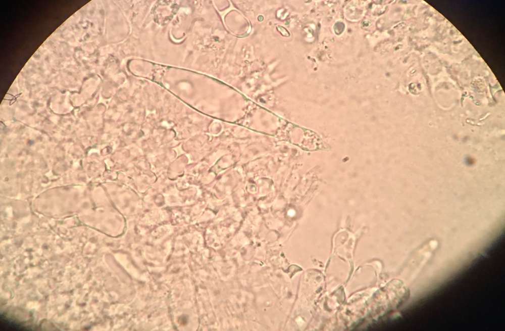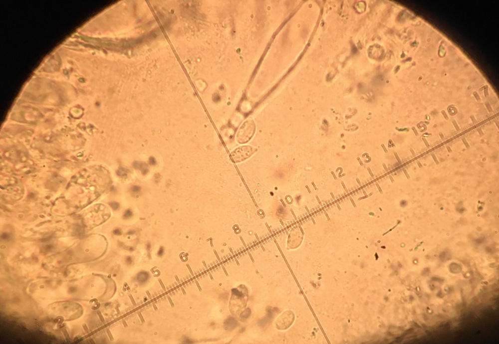 Die Sporen der mycena von 8x5 bis 11x5,5, die meisten 9-10x5, die Zystiden messen ca. 75x10. Ich habe auch noch Zystiden mit Auswüchsen gefunden, allerdings nur wenige. Milch war trotz mehreren Versuchen, auch vor Ort, nicht festzustellen, komisch...