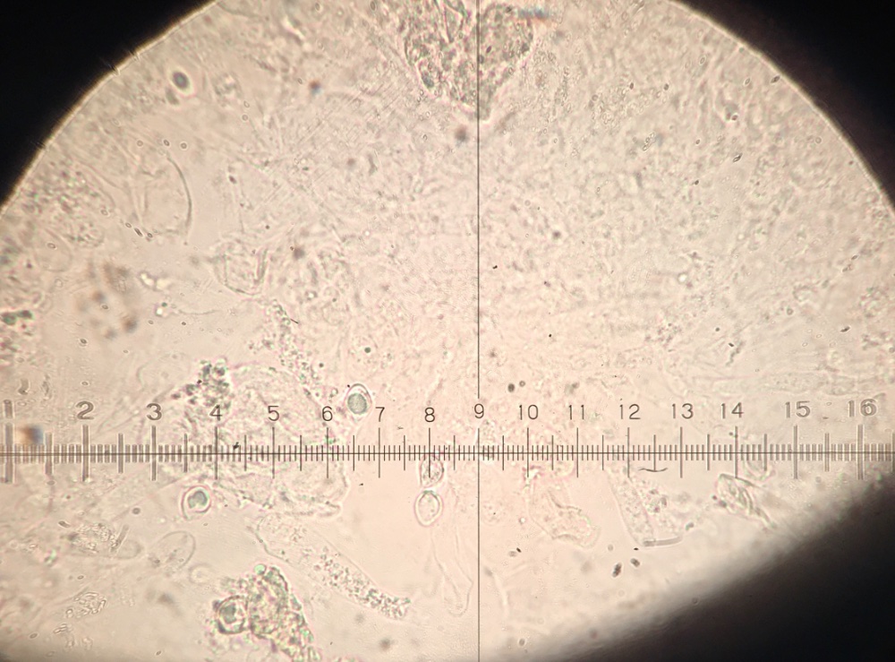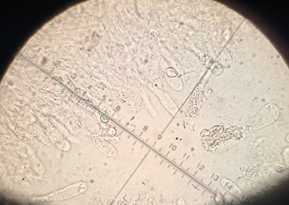 Die Sporen messen 7-10 x 5-6, sind aber eher unter 9 lang.