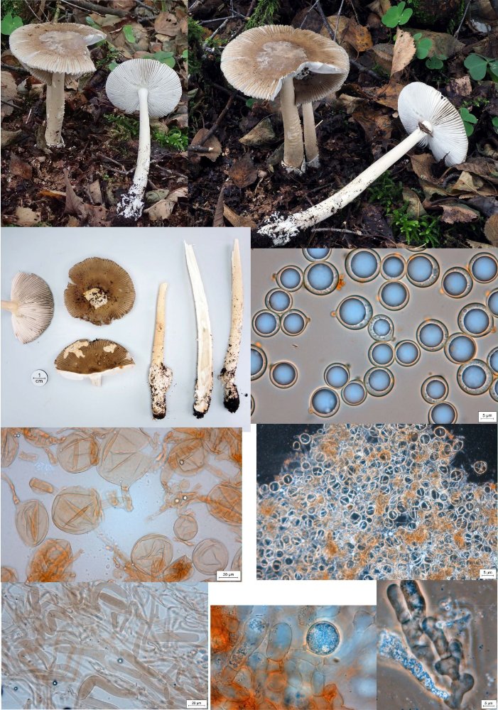 Merkmale: Frkp gebrechlich, haselbraun, unicolor, stark gestreift, mit weißlichen , aufbrechenden Flocken am H. die dann gelbbräunlich verfärben, St. mit schwacher Natterung, Volva am St vorhanden aber nicht üppig und relativ fragil weiß (außen und innen) teilweise mit gelben Flecken, Lam jung weißßlich, dann graulich und eher nicht stark gedrängt, Sporen globos 10 – 14, Bas. 1-,2- und 4-sporig ohne Schnallen, Subhymenium zellig, V. mit zahlreichen Sphaerozystiden, KK Reaktion konnte ich nicht feststellen.