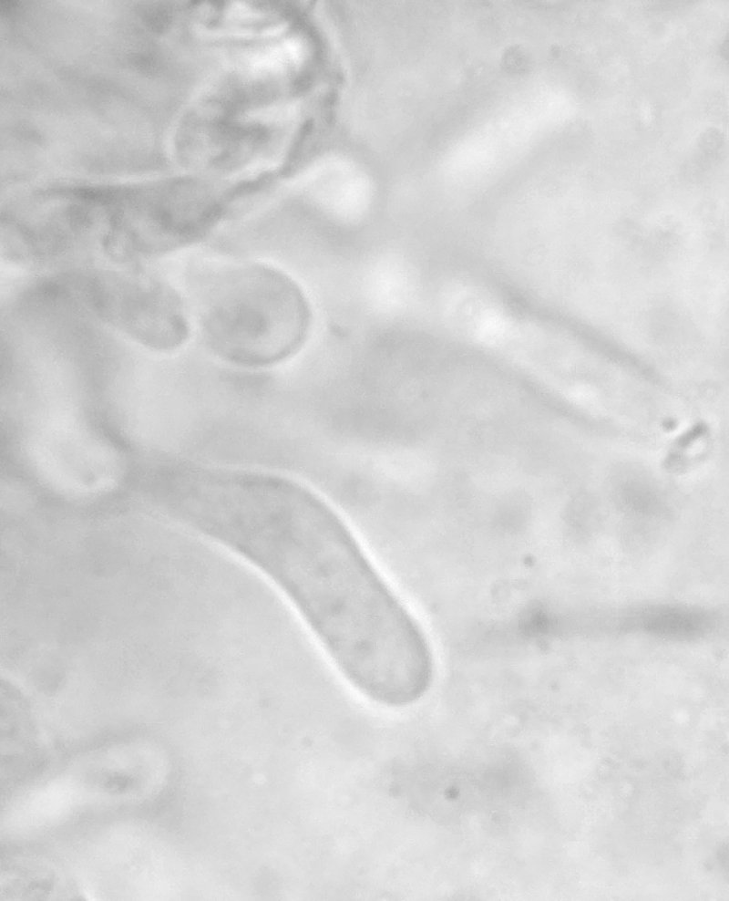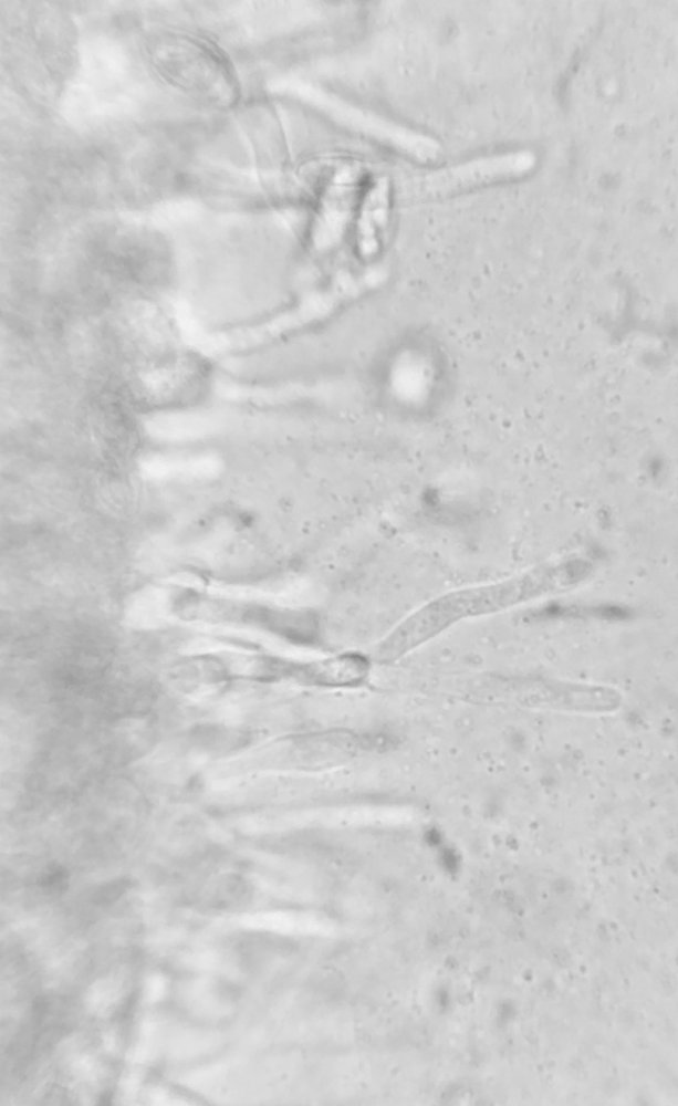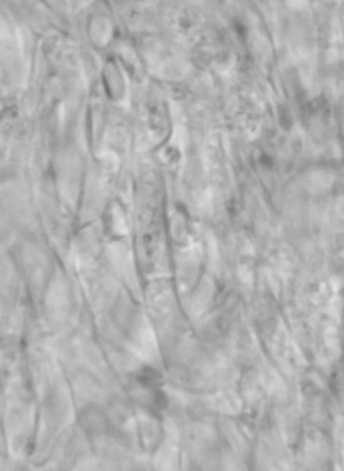 Lamellenschneide mit zahlreichen, auffallenden Cheilocystiden, diese ca. 30 - 60 x 2-5,5 µm, meist fädig, apikal auch etwas verbreitert bis fast spatelig, nicht kopfig, oft aber mit abgerundeten Enden, untermischt mit Basidien, aber Cystiden sehr zahlreich.