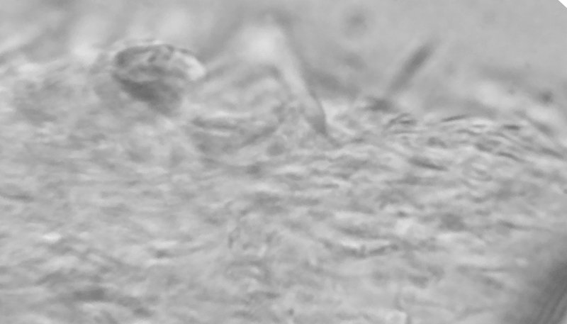 Weißer Bereich: Cutis aus Hyphen 2-4,5 µm dick, meist recht schmal, ohne inkrustierendem Pigment, Zellwände teils in Wasser etwas lichtbrechend; Brauner Bereich: Cutis kollabiert, Hyphen nur sehr vereinzelt noch zu erahnen, die meisten Zellen zusammengedrückt;