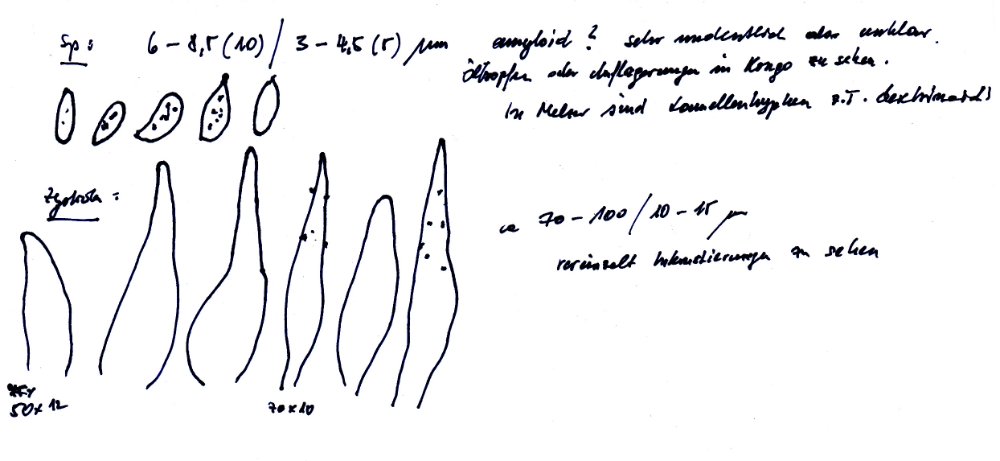Die Mikroskopie zeigte zahlreiche markante, lanzettliche bis 100 µm lange Zystiden (erinnern an Gurkenschnitzling), die Sporen:6-10/3-5 µ, leicht amyloid (bin mir aber nicht sicher. Sporenpulver weiß!