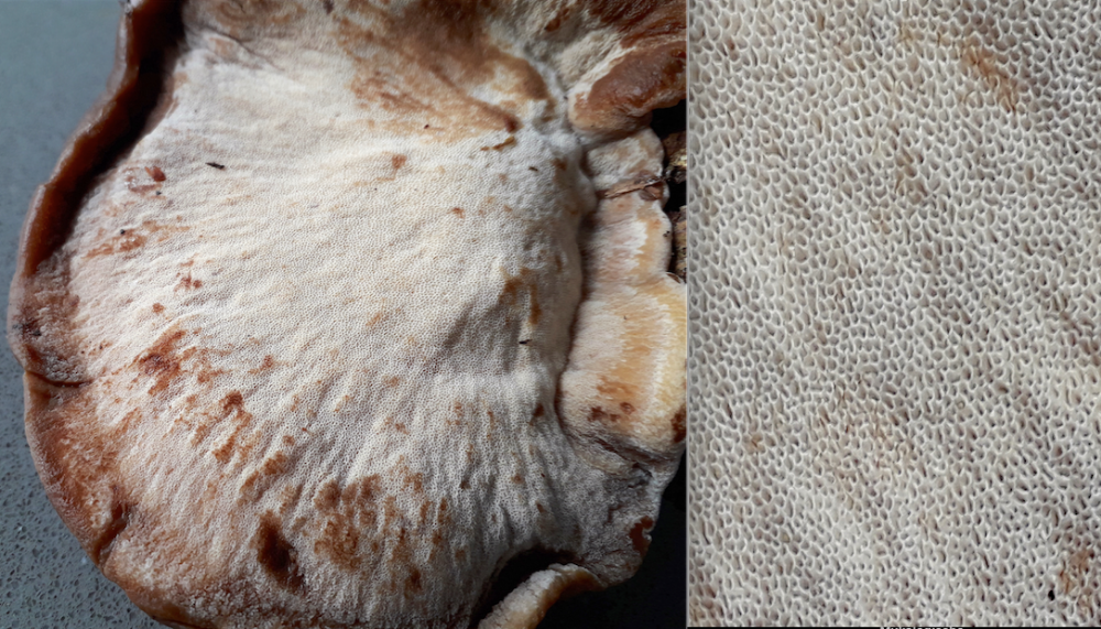 vermutlich Fichte oder Weisstanne. Geruch angenehm pilzig-süsslich. Die Fruchtkörper sind an der Basis zäh
