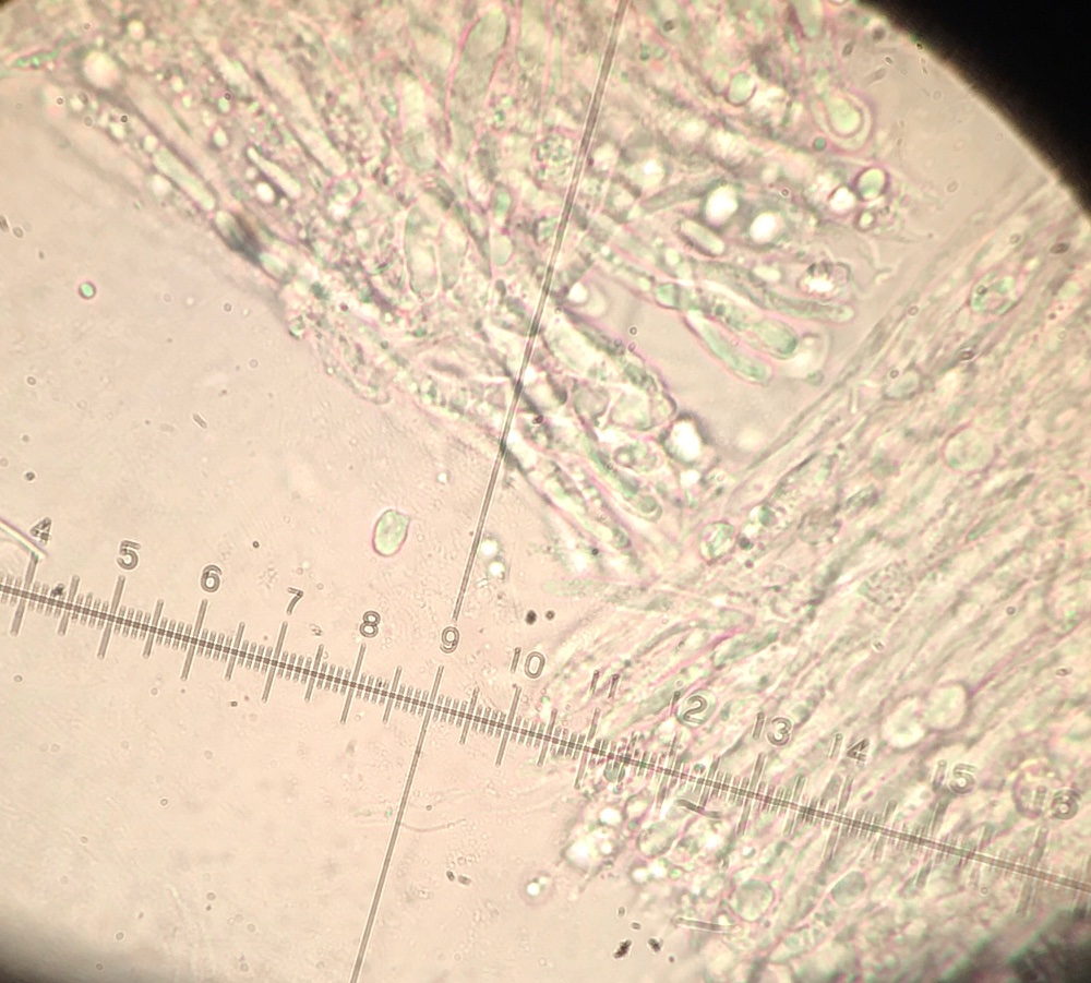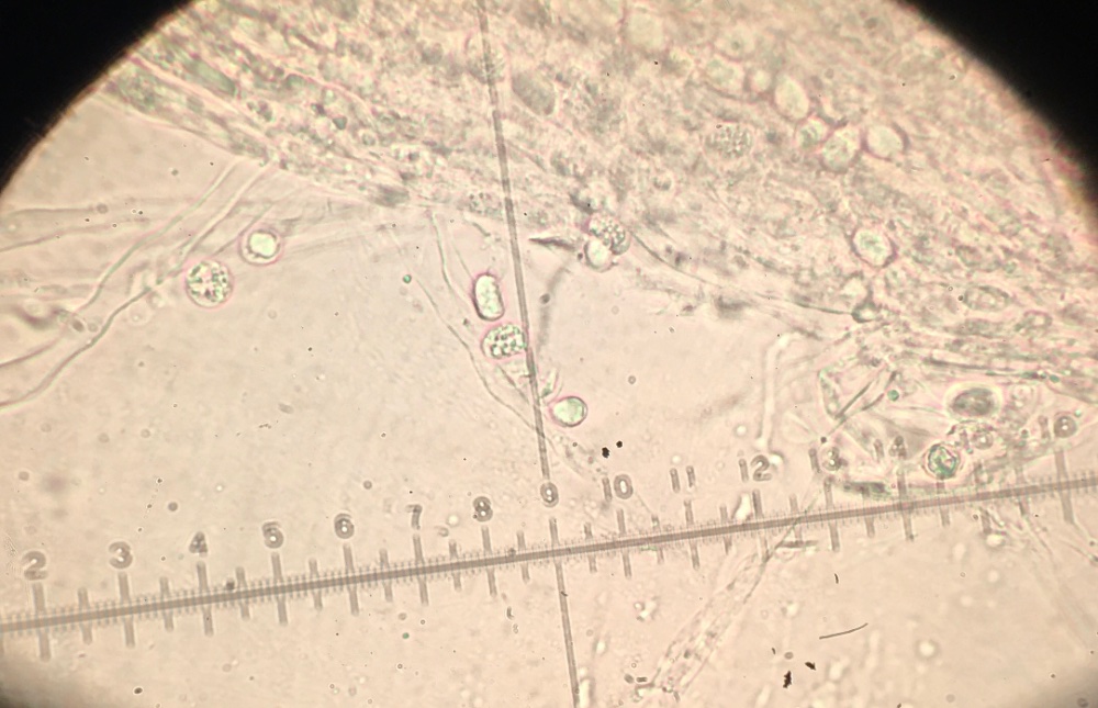 Die Sporen machen mich etwas ratlos, denn manche sind glatt und messen 5 - 5,5 x 4 - 5, die anderen sind granuliert (ich denke sie haben einen Inhalt) und messen 6 - 8 x 5. Ich nehme mal an, das sind reife und weniger reife Sporen. Überhaupt war es schwierig zu erkennen, was Sporen sind und was nicht.