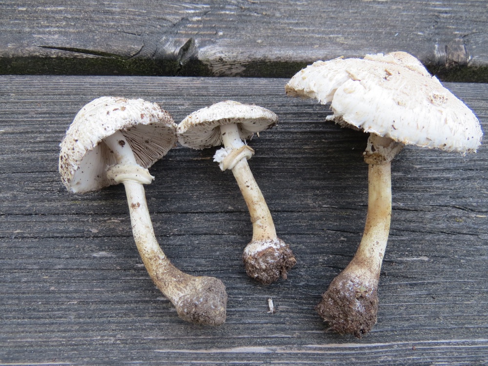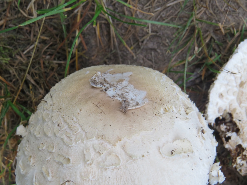 Auffällig war, dass die Pilze fast geruchsneutral waren und nicht den typischen Parasol-Geruch hatten. Die Ringe waren allesamt angeklebt und nicht verschiebbar. Stielnatterung ist wenn überhaupt nur sehr fein erkennbar. Die Schuppen der Hüte hatten fast die selbe Farbe wie der Untergrund. Am Hut des großen Pilzes sind oben weiße häutige Velumsreste zu erkennen. Die Stiele sind nicht so gerade wie ich sie sonst Macrolepiota kenne sondern mehr oder weniger verbogen. Ich habe auch versucht einen Sporenabwurf zu machen, aber da war ich etwas spät dran, als der Pilz schon antrocknete, sodass nichts aussagekräftiges hinsichtlich der Farbe des Sporenpulvers herauskam.