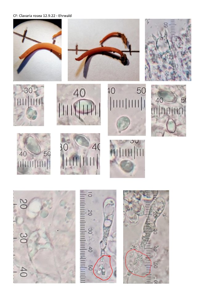 Das sind Schnallen, dementsprechend kann es auch nicht Clavaria rosea sein. Man landet am ehesten bei C. incarnata, wobei die Sporen bei deinem Fund für diese Art doch etwas kurz sind – vielleicht waren sie noch nicht ganz reif? Jedenfalls ein interessanter Fund, diese rosafarbenen Keulchen sind ja alle ziemlich selten.Bei 2 Basidien habe ich 2 Verzweigungen umkreist. Was ist das?