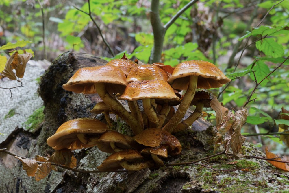 Am 7. 10. war ich in einem sehr bekannten Buchenwald und konnte einen brombeerartigen Pilz entdecken, den ich grob als Metatrichia sp bezeichnet habe? aufgrund des nur angedeuteten Ringes und des rein braunen Sporenpulvers habe ich diesen Pilz als Stropharia caerulea benannt - was meint ihr? zu diesem Becherpilz wird man wohl nichts sagen können ... vielleicht Peziza sp.? Romana war so lieb und hat mir bei Dentipellis vagilis (Korrektur Romana: D. fragilis) geholfen. Auf sehr dickem Buchen-Totholz gibt's bekanntermaßen Pholiota squarrosoides zu beobachten: komischerweise auch auf Totoholz: Clitocybe diatreta (beide Arten hat mir Irmgard schon bestätigt): In Moidrams gab's für die Jahreszeit passende Bestände von Hygrophorus agathosmus mit herrlichem Marzipanduft: Wie immer freue ich mich über Bestätigung oder gnadenlose Korrektur