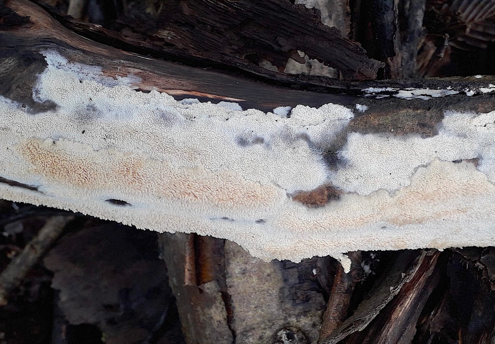 Der Pilz unten links könnte durchaus Peniophora incarnata sein. Wächst hier zusammen mit Hypoxylon howeanum.