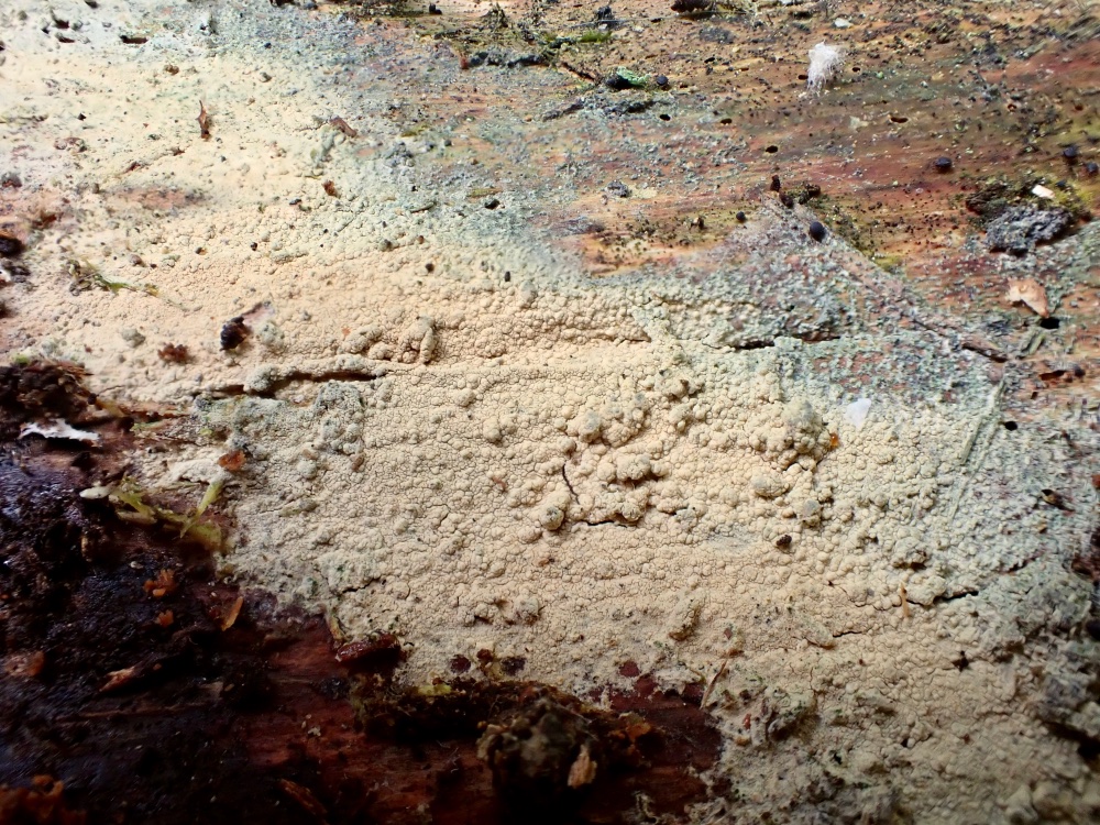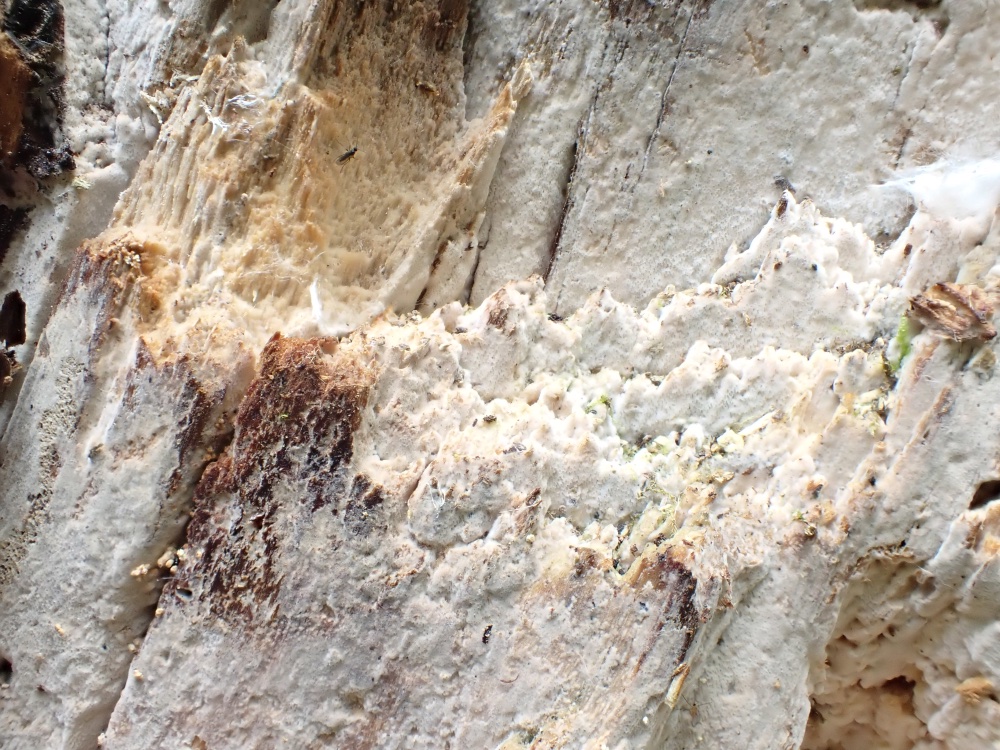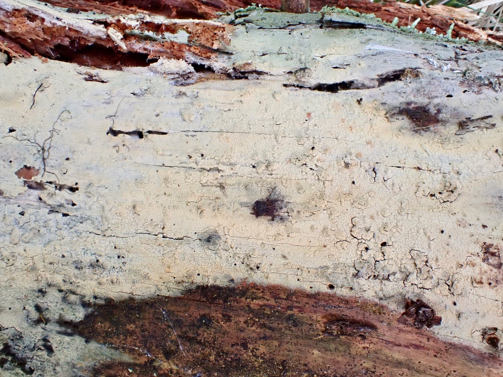 Die porlingsartigen Strukturen bildeten sich nur tw. aus. An der Oberseite war nur ein weisser Filz vorhanden, der mikroskopisch mit den porlingsartigen Strukturen ident war. Dahinter am liegenden morschen Stamm fand ich rotbraue Strukturen, die mich an einen alten Schleimpilz oder an Botryobasidium aureum erinnerten. Davon gibt es aber (leider) keinen Beleg. An der Oberseite wuchs Scutellinia crinita auf dem Porling.