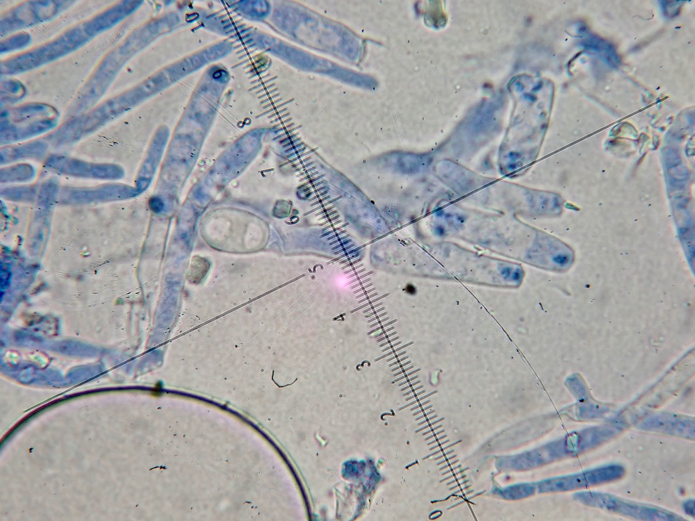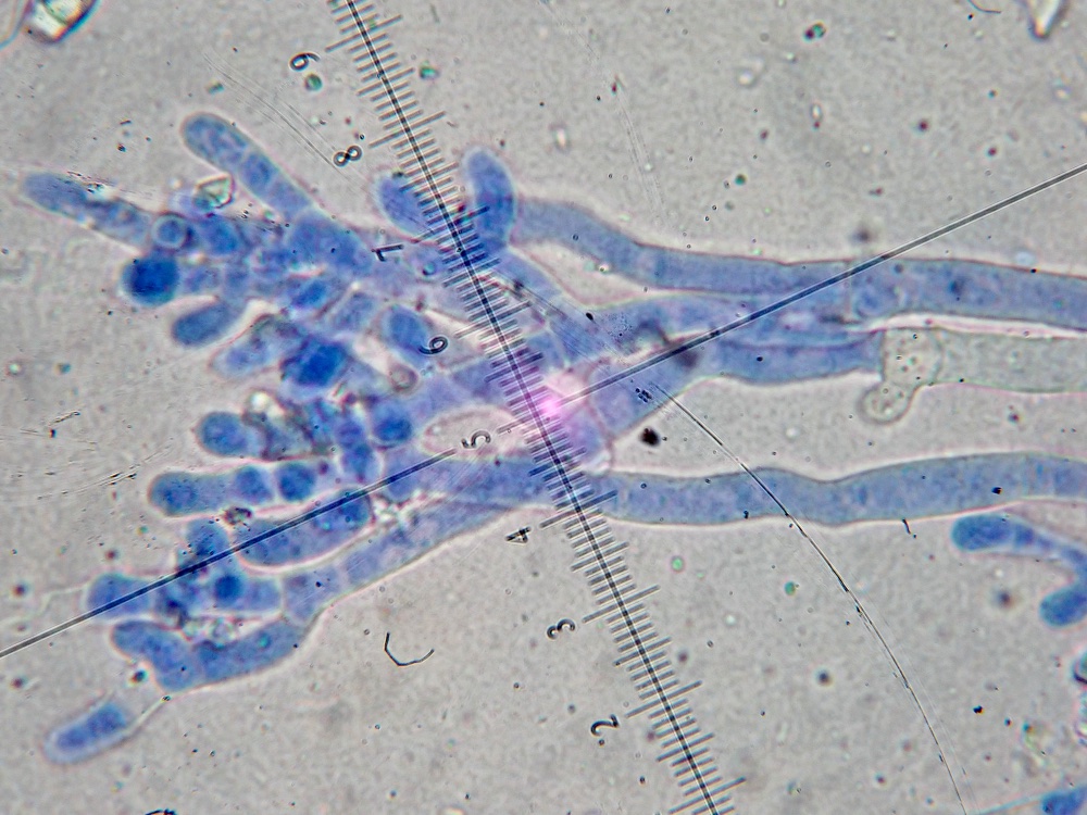 Locker stehende rechtwinkelig verzweigte Hyphen mit zahlreichen Septen, 3-5ym breit. Daraus (aber da bin ich mir nicht sicher) spalten sich einzelne Konidien ab?