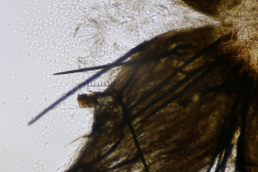 Die Fruchtkörper sind ca. 0.3 mm groß und haben ebenfalls Seten - diese jedoch nur an der Basis.