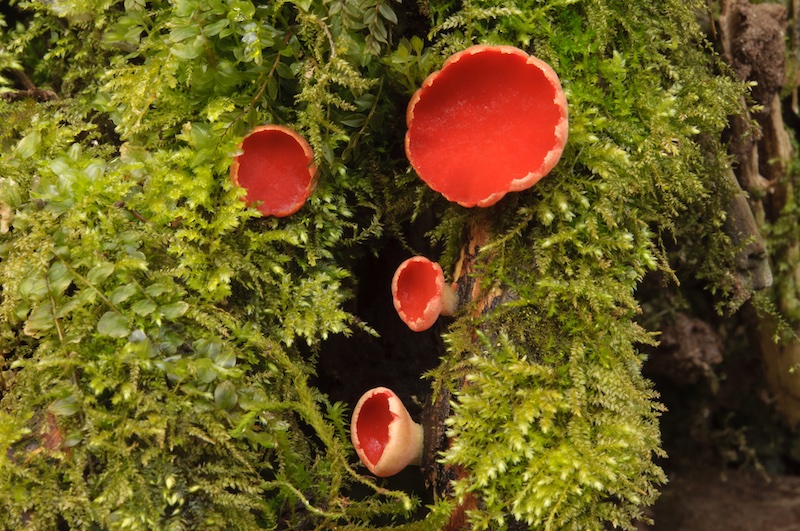 wo es derzeit feucht genug ist, hat man gute Chancen, auf Kelchbecherlinge zu stoßen – mit etwas Glück sogar auf zwei verschiedene Arten, S. austriaca und S. coccinea. Noch deutlich mehr Glück, welches mir bislang fehlte, braucht man, um die dritte Art im Bunde (S. jurana) zu finden...