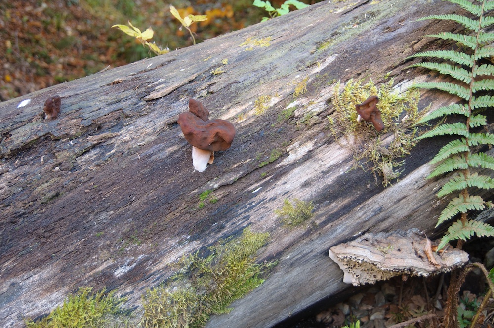 Gyromitra infula + Ganoderma applanatum: Liegender Fagus-Stamm. Hab die Bischofsmütze noch nie vorher an Laubholz gesehen.