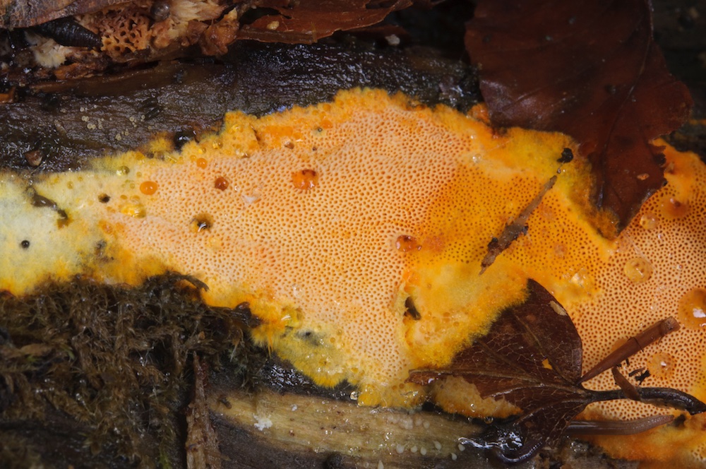 Flaviporus citrinellus (= Antrodiella citrinella): Ein charakteristischer Urwaldpilz, der an von Fomitopsis pinicola befallenen Nadelholzstämmen wächst (hier Picea).