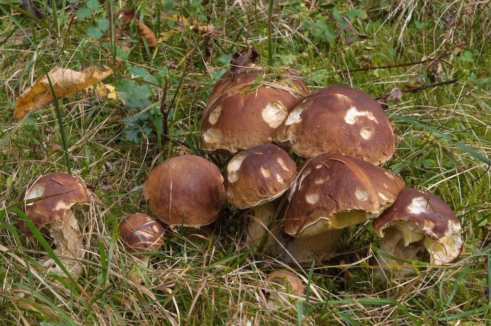 Boletus edulis: Fast ein Dutzend Exemplare, die hier auf engstem Raum wuchsen.