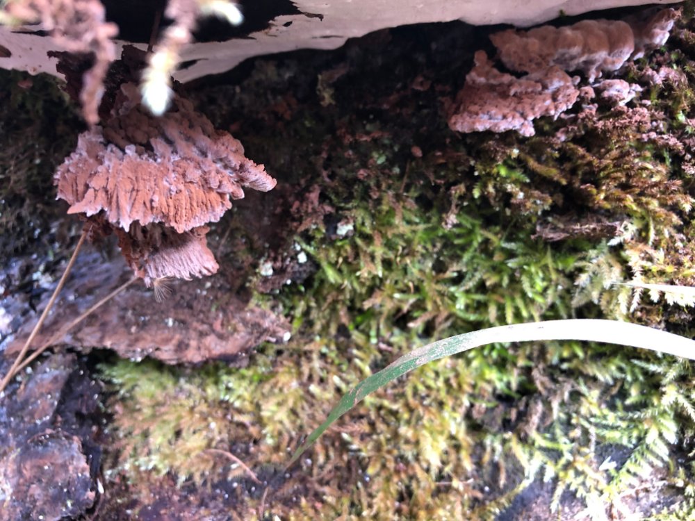 Mucronella calva s. l.: Unterseite von Fomitopsis pinicola.