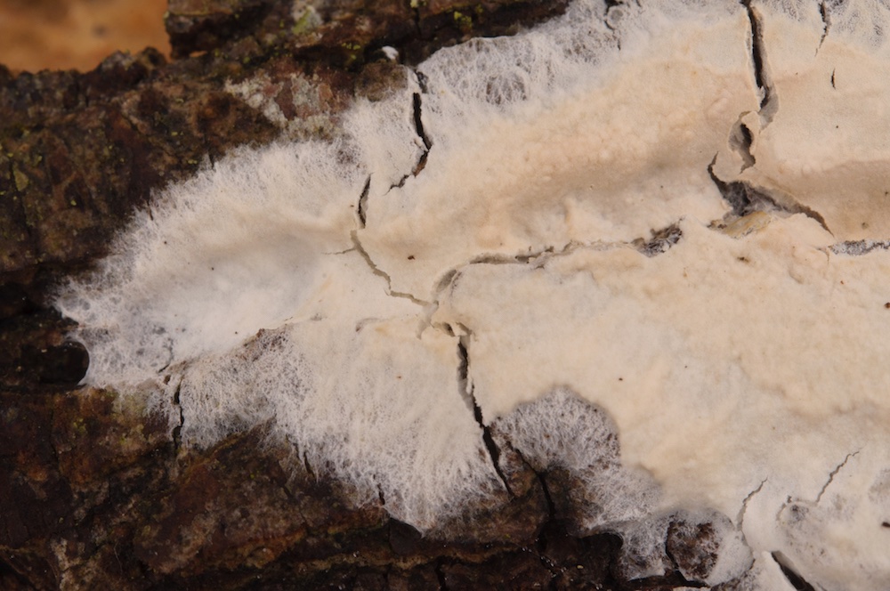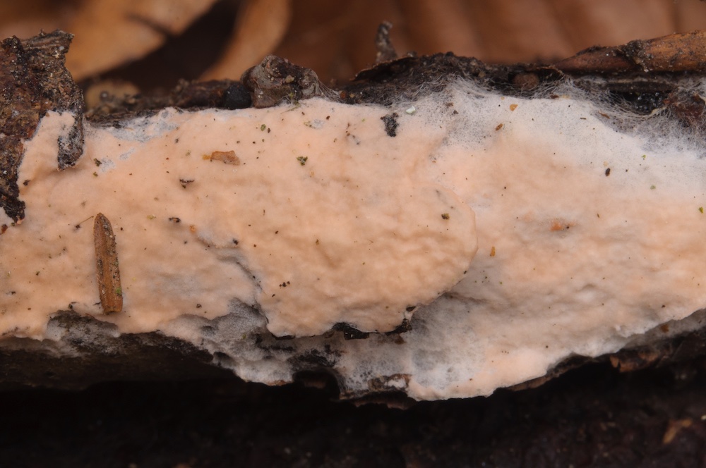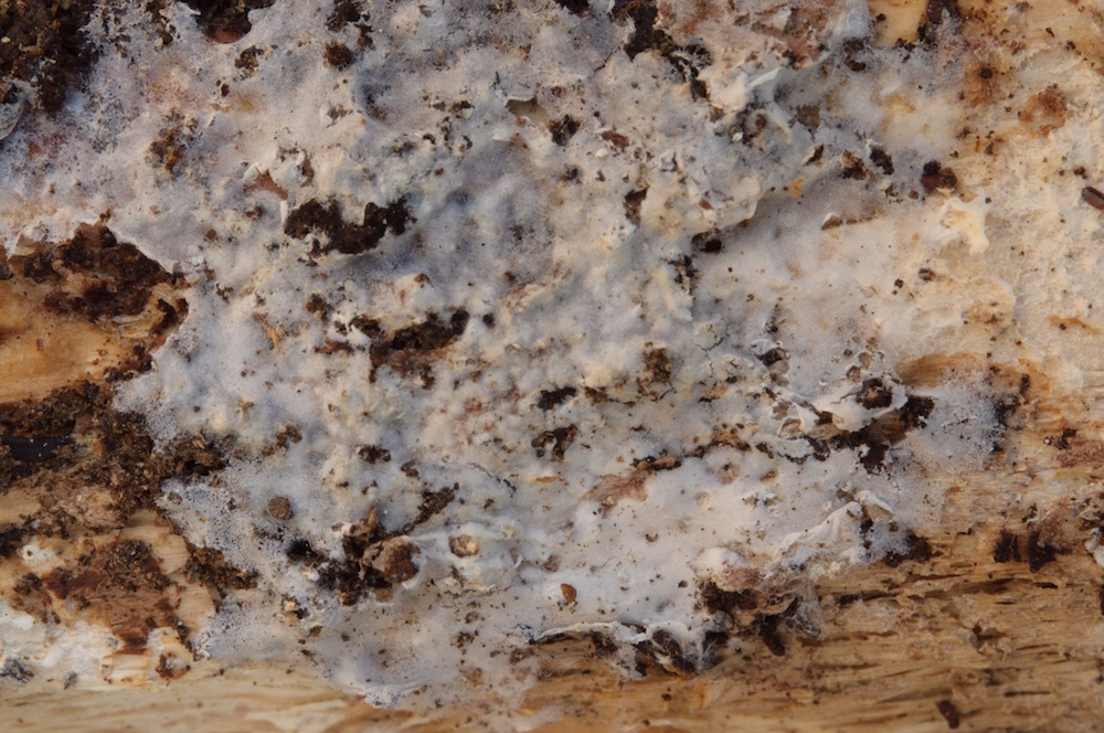 Athelia arachnoidea: Liegender Picea-Ast. Durch zweisporige Basidien, entsprechend große Sporen und fehlende Schnallen recht leicht zu bestimmen.