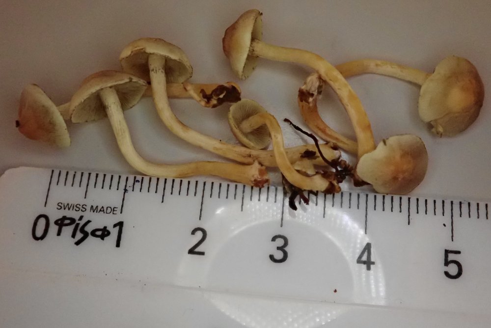 Tubaria conspersa - wärest du mit Pholiotina velata einverstanden? Die Sp. sind inetwa gleich groß und die Zystiden sind auch sehr ähnlich. Allerdings sind die Sp. bei der Tubaria dünn- und bei der Pholiotina dickwandig. Eigentlich schauen die Sp. auf meinen 40-fach-Vergrößerungen schon eher dickwandig aus. Was ist der Hauptgrund, dass es keine Tubaria ist, der weiße Stiel, die Lamellenfarbe ...?