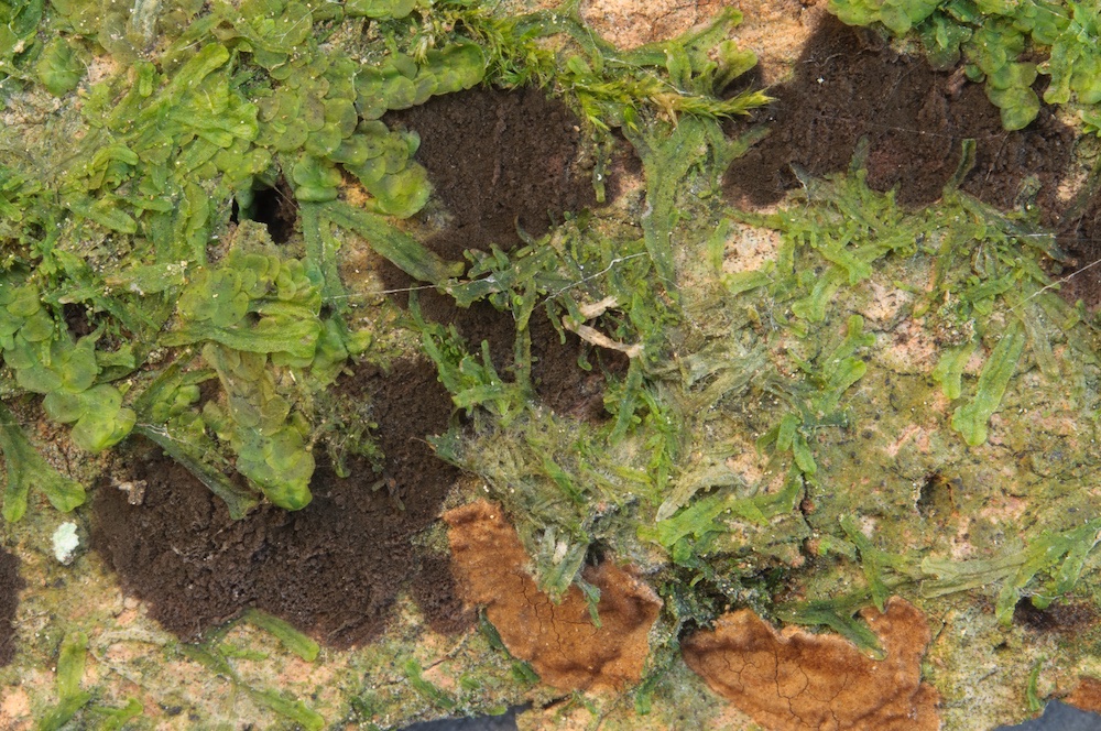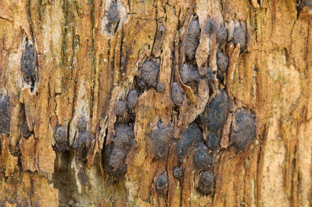 Virgaria nigra und Hymenochaete carpatica: Borke von Acer pseudoplatanus.