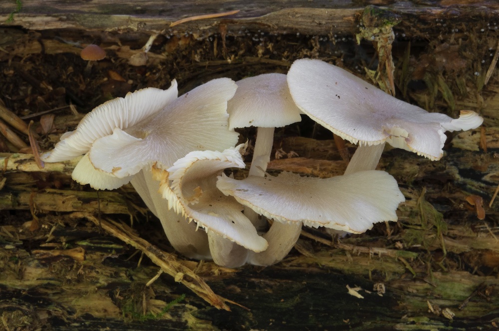 Gymnopus inodorus: Liegendes Borkenstück in der Laubstreu.