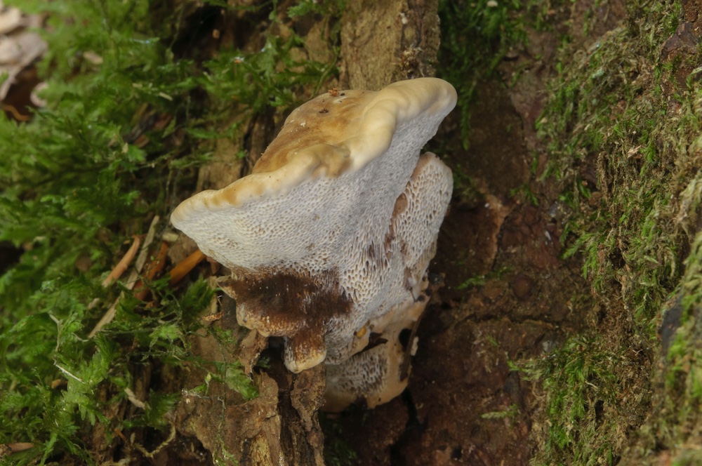Skeletocutis kuehneri: Liegender Picea-Stamm, auf alten Fruchtkörpern von Trichaptum abietinum. .