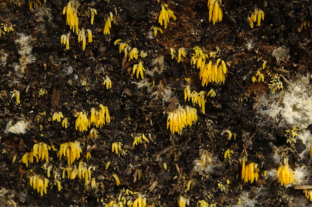 Mucronella cf. flava: Feuchtes Holz einer Sitzbank. Die Sporen sind zu rundlich für M. flava und zu klein für M. bresadolae... .