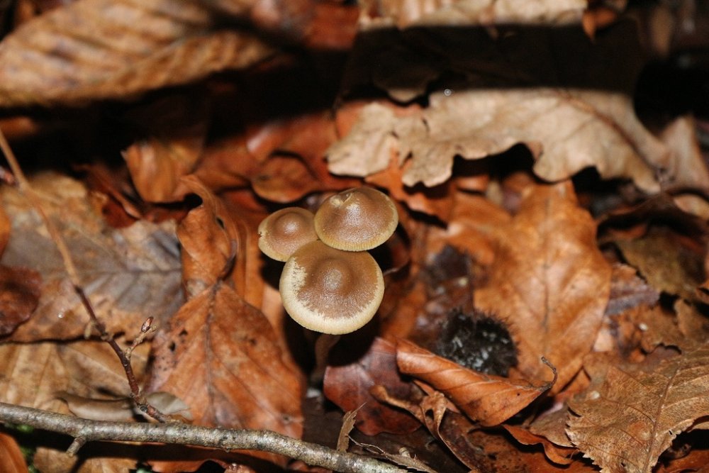Junge Fruchtkörper nützen das Laub als Tarnhaube, da ist die Nase in Zeckenreichweite,