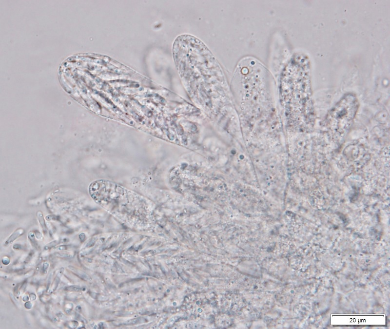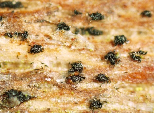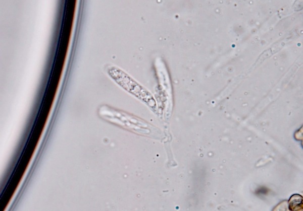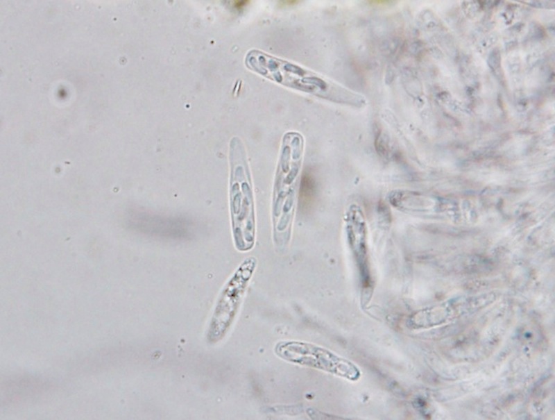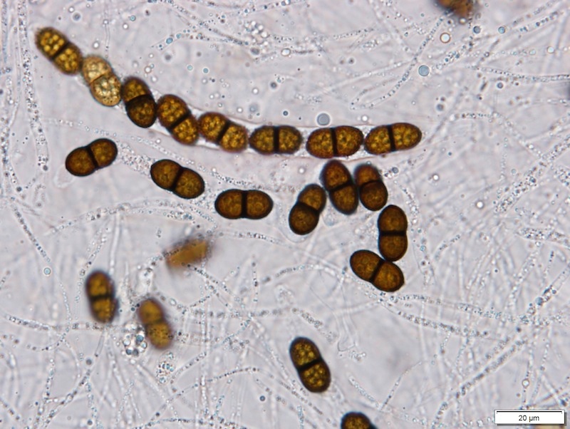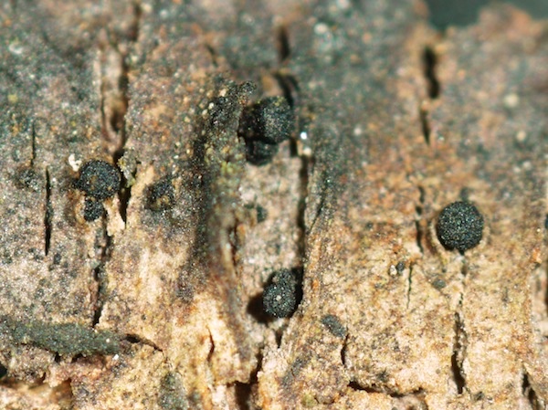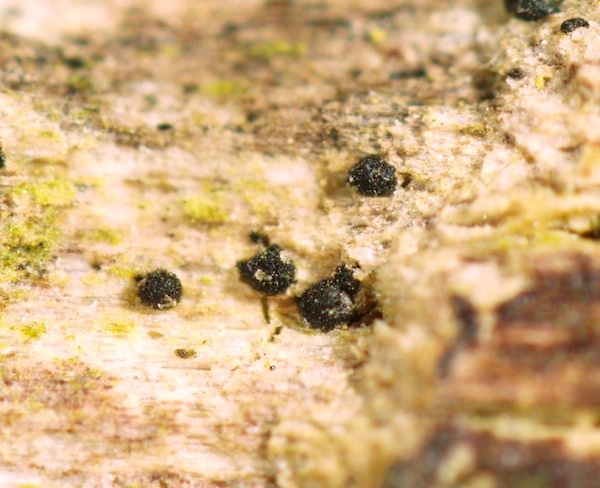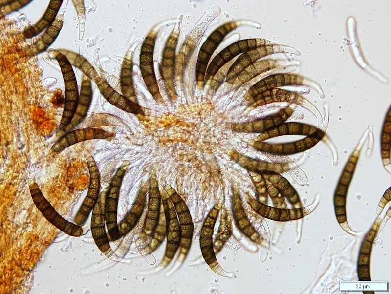Typisch für die Gattung Coniochaeta sind die schwarzen, kugeligen, oberflächlichen, behaarten Fruchtkörper (natürlich gibt es Ausnahmen mit anderen Merkmalen) in Kombination mit braunen Sporen + Keimspalten. Diese Kollektion nenne ich mal Coniochaeta cf. velutina, da mir die Sporen (nur ca. 7–8 µm lang) etwas zu rundlich erscheinen.